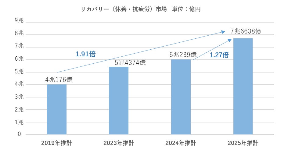 家計調査(2025年)に、休養分科会算出の独自係数(休養行動、疲労回復行動の実施率など)を掛け合わせた、リカバリー(休養・抗疲労)市場規模は、2025年推計で7兆6638億円となっている。2024年推計の6兆239億円と比較して1.27倍の伸びを示しており、前年から大きな成長が見られる。さらに、2019年推計の4兆176億円から2025年推計までの成長率は1.91倍となり、リカバリー市場は継続的な拡大傾向にあることが分かる。