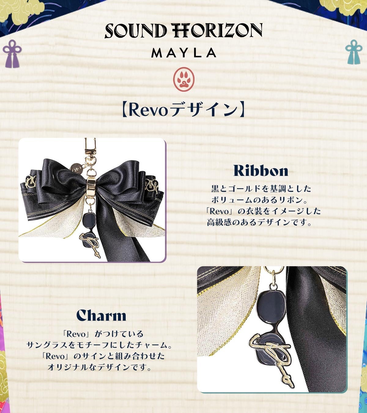 Revoデザインでは、「Revo」の衣装をイメージした黒とゴールドを基調としたボリュームのあるリボン。「Revo」がつけているサングラスをモチーフにしたチャーム。「Revo」のサインと組み合わせたオリジナルなデザインです。