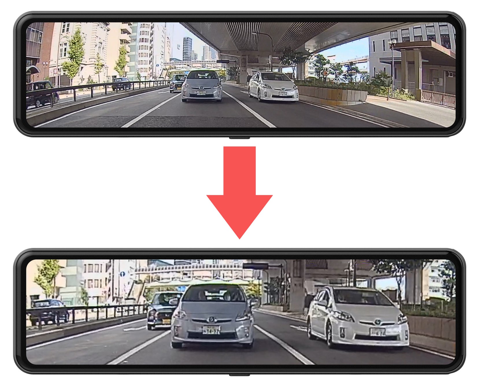 従来のデジタルルームミラーでは実際の車間距離とデジタルミラーでの車間距離が異なる事が有りましたが、新機能のズーム(拡大/縮小)機能では最大15段階の設定が可能、違和感の無い車間距離に設定することが可能です。