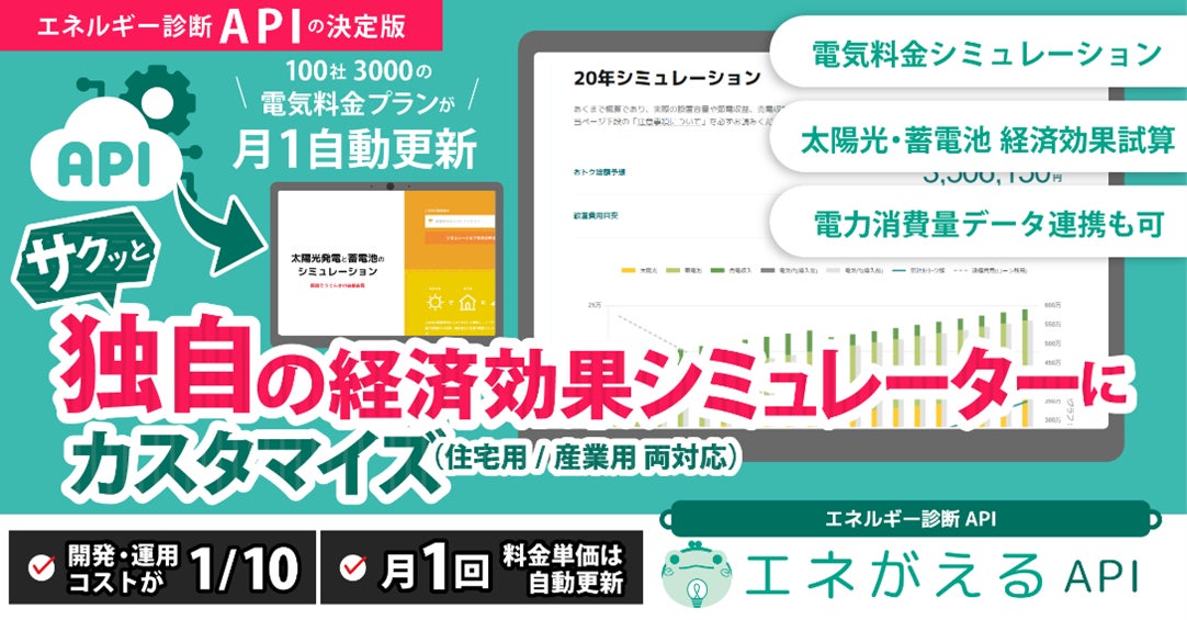 国際航業株式会社(本社:東京都新宿区、代表取締役社長:土方 聡)は、クラウド型で再生可能エネルギー(再エネ)導入の経済効果を試算可能な『エネがえるAPI』を、大幅にアップデートしました。今回のアップデートにより、住宅用のみにとどまらず、産業用自家消費型太陽光・蓄電池、EV・V2H・充電器、自治体補助金情報まで対応領域を拡大し、2025年3月18日より提供を開始します。