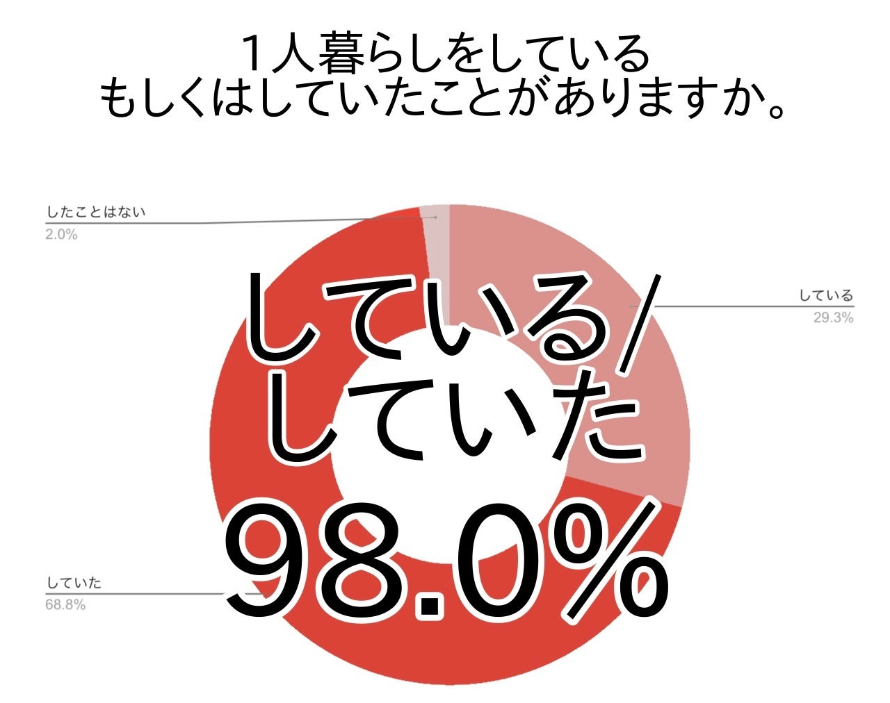 今回のアンケートでは1人暮らしをしている/していたことがあると答えた方は98.0%で、ほとんどの方が1人暮らしを経験していることがわかりました。