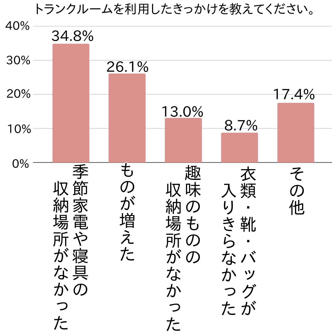 1人暮らし、特に都市部で十分な収納スペースが取れない場合には、トランクルームが有効活用されていることがわかりました。そこでアンケートでは、トランクルーム利用者に利用したきっかけを尋ねてみました。