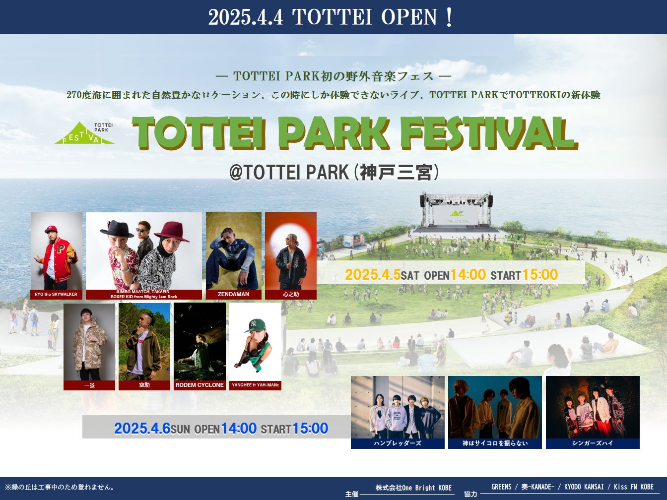 株式会社One Bright KOBE(住所:兵庫県神戸市、代表取締役社長 渋谷 順)は、日本初・270度海に囲まれたアリーナ「GLION ARENA KOBE(ジーライオンアリーナ神戸)」を中心としたエンターテインメントエリア「TOTTEI(トッテイ)」の一体運営により、神戸に誇れる最先端エンターテインメントエリアの誕生を目指しています。このたび、国内初「港湾環境整備計画」の認定を受け、港を緑化したシンボリックなパーク「TOTTEI PARK(トッテイ パーク)」の開業(※1)にあたり、心地よい海風と共にお楽しみいただく「TOTTEI PARK FESTIVAL」のタイムスケジュールをお知らせします。