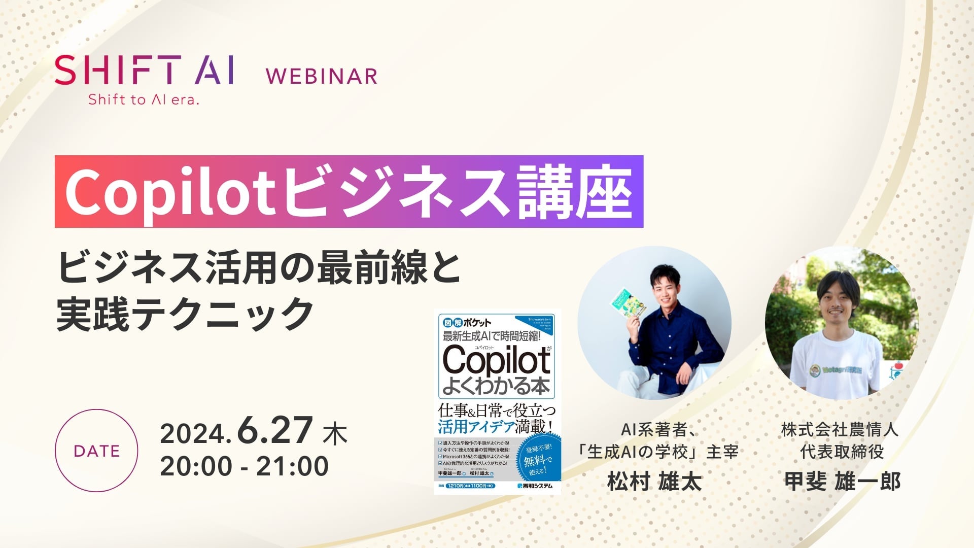 2024年6月18日に発売された『図解ポケット 最新生成AIで時間短縮! Copilotがよくわかる本』の出版を記念し、著者の甲斐雄一郎氏と監修者の松村雄太氏が、2024年6月27日(木)20時より開催される中級者向けオンラインセミナー「Copilotビジネス講座:ビジネス活用の最前線と実践テクニック」に登壇します。本セミナーでは、Copilotのビジネスシーンにおける具体的な活用方法、Copilot Proの導入メリットなどを、実践的なアプローチで解説します。