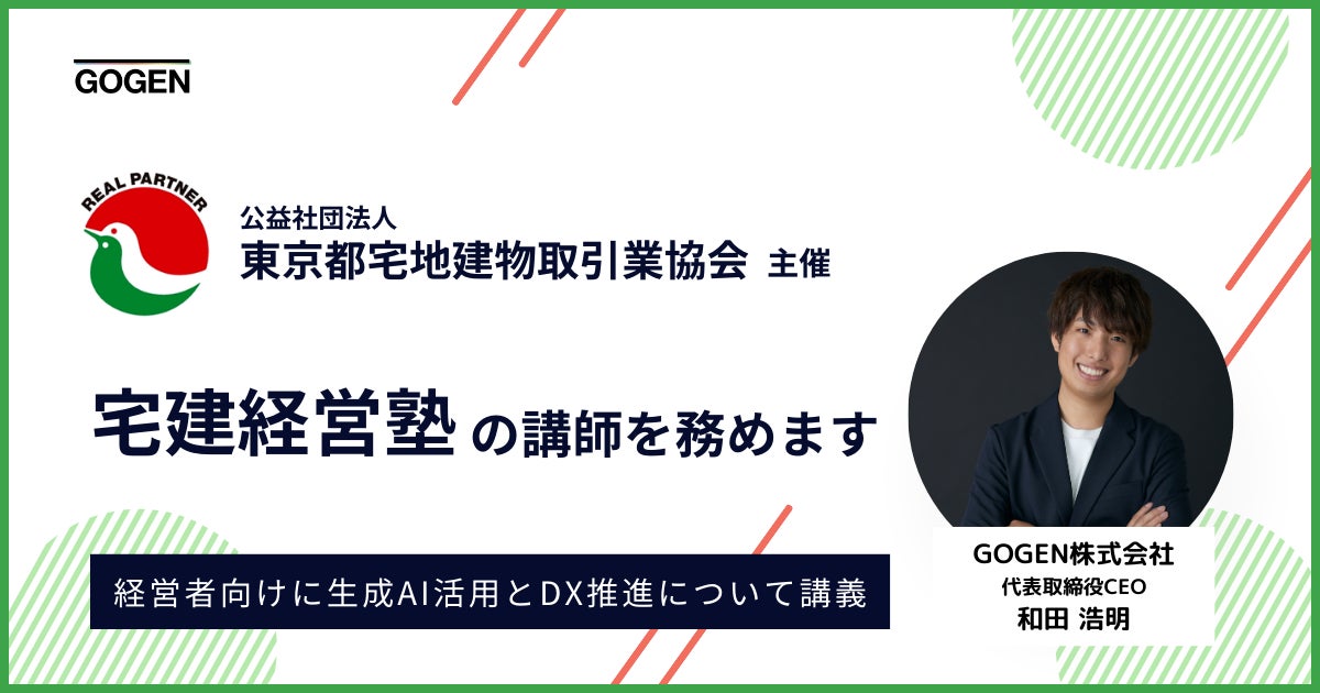 不動産売買支援ハブ「レリーズプラットフォーム」の開発・提供をするGOGEN株式会社(本社:東京都港区) の代表取締役CEO:和田 浩明が、2024年9月23日(月)より配信されるオンデマンド配信講座「宅建経営塾」の講師を務めます。