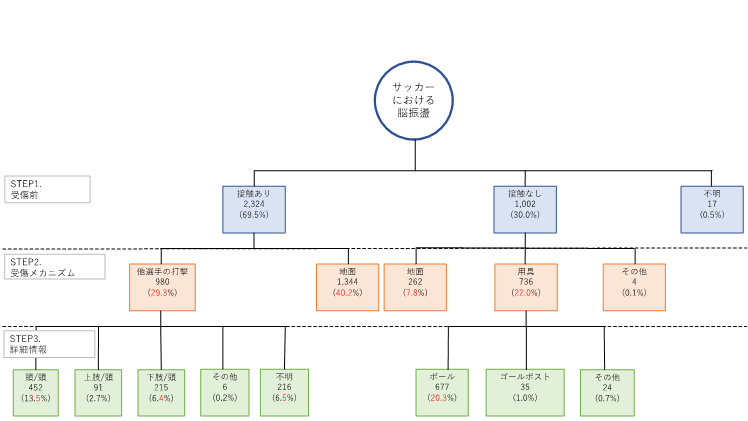 本研究は、2012年から2022年の災害共済給付制度データを用いた後方視的観察研究です。サッカー関連の傷害申請696,600件から脳振盪3,343件を抽出し、性別・学年別に受傷機転を分類しました。