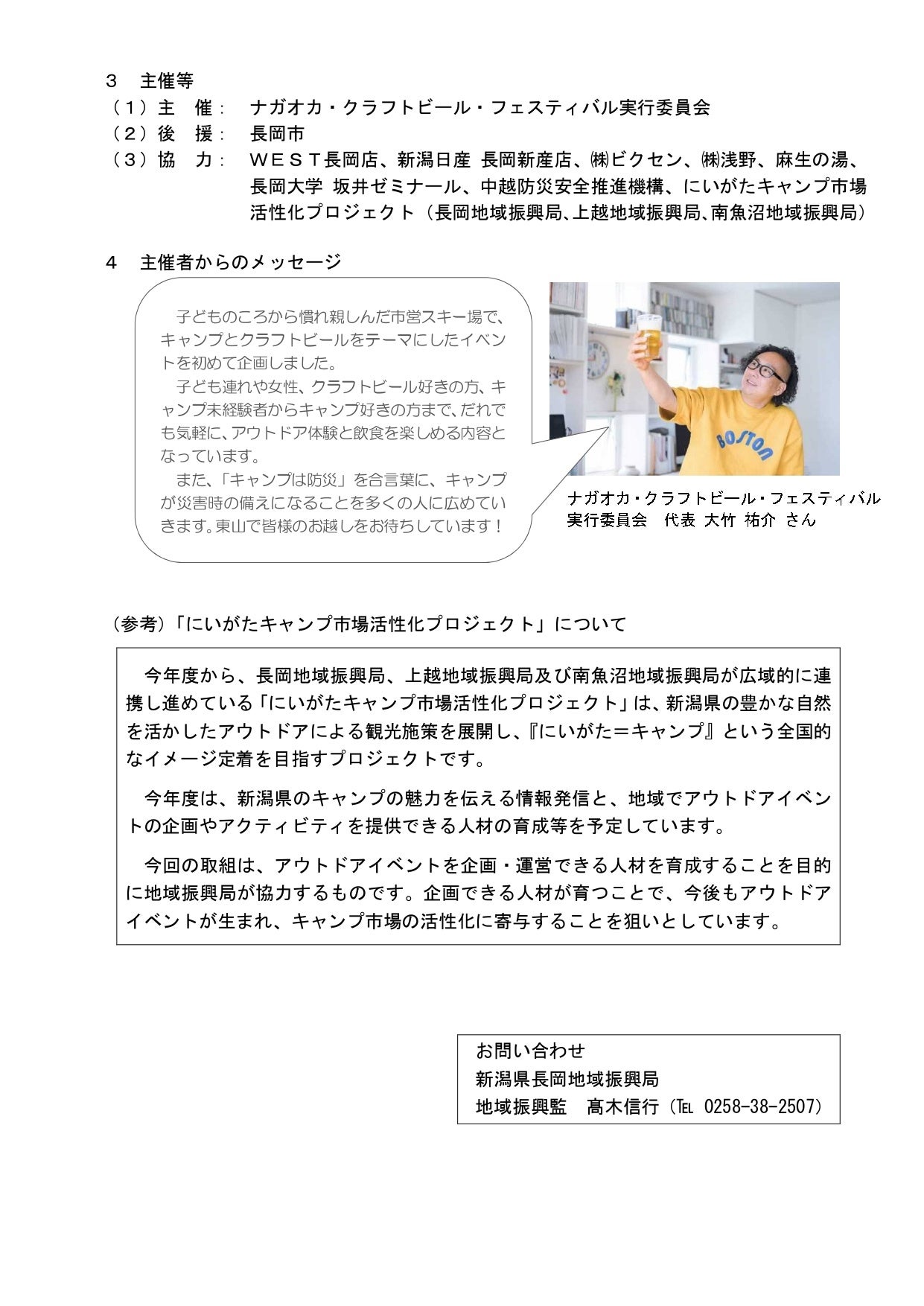 (3)協 力: WEST長岡店、新潟日産 長岡新産店、㈱ビクセン、㈱浅野、麻生の湯、 長岡大学 坂井ゼミナール、中越防災安全推進機構、にいがたキャンプ市場 活性化プロジェクト(長岡地域振興局、上越地域振興局、南魚沼地域振興局)