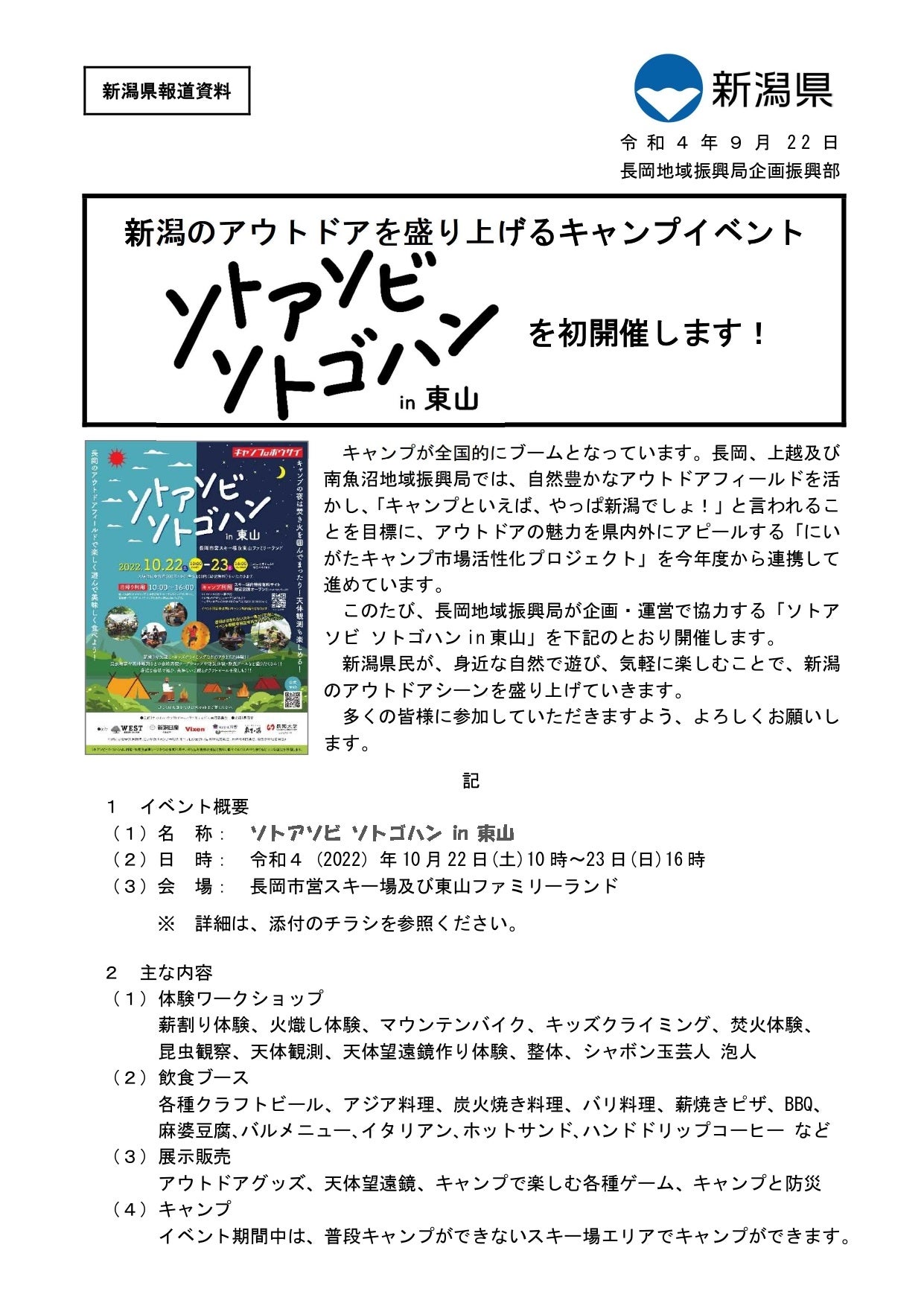 新潟のアウトドアを盛り上げるキャンプイベント「ソトアソビ ソトゴハン in東山」を10月22日(土)・23日(日)に初開催します!(新潟県長岡市)