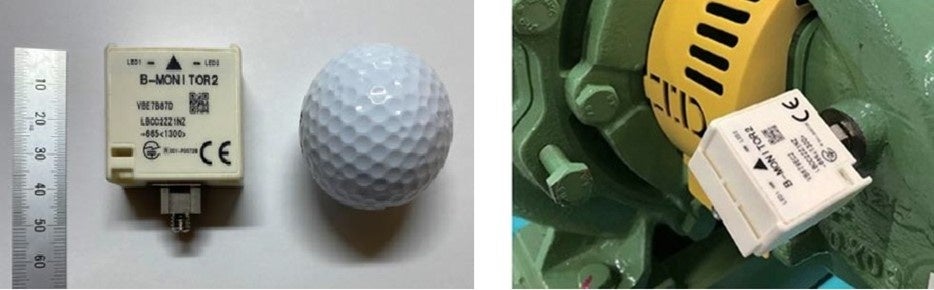 使用する小型無線式センサはリチウム電池を電源としているため、監視対象の回転機械に電源および制御配線工事なしで、簡単に後付けで設置することができます。また一般的な無線式振動センサは2,000~3,000 Hzまでしか測定できないことが多いですが、本センサは8 Hz~10,000 Hzまでを1 Hzきざみで測定できるため、高周波の領域に現れる故障の予兆も捉えられます。