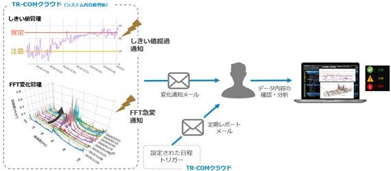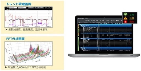 小型無線式センサから得られる対象機械の「振動加速度」、「振動速度」、「温度」のデータは、クラウドに転送・保存されるため、WEBブラウザを用いて遠隔地でも機械の状態監視やデータ分析を行うことができます。また、振動スペクトルを時系列に蓄積および監視することで異常兆候の推移が可視化され、熟練技術者による音の変化、異常の見極めと同等の保全管理を実現できます。時系列の振動スペクトルの形状から、機械の異常原因を推定することも可能です。
