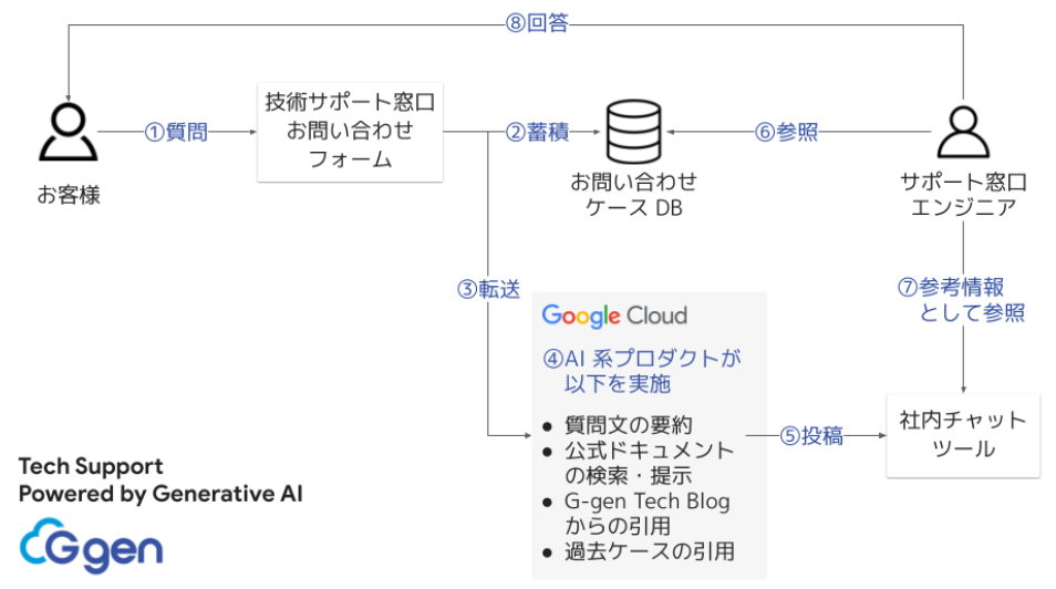 G-gen の Google Cloud 請求代行サービスおよび Google Workspace 請求代行サービスでは、付帯サービスとして技術サポート窓口を提供しています。同窓口では、これまで公式ドキュメントに加えて G-gen やグループ会社の知見を活かした問い合わせ対応を行っていました。業務効率化のため、同窓口では 2023年9月25日より、Google Cloud の AI 系サービスを活用した業務補助システムの運用を開始しました。同システムは Tech support powered by Generative AI と呼ばれ、以下の図は同システムの概要を示したものです。