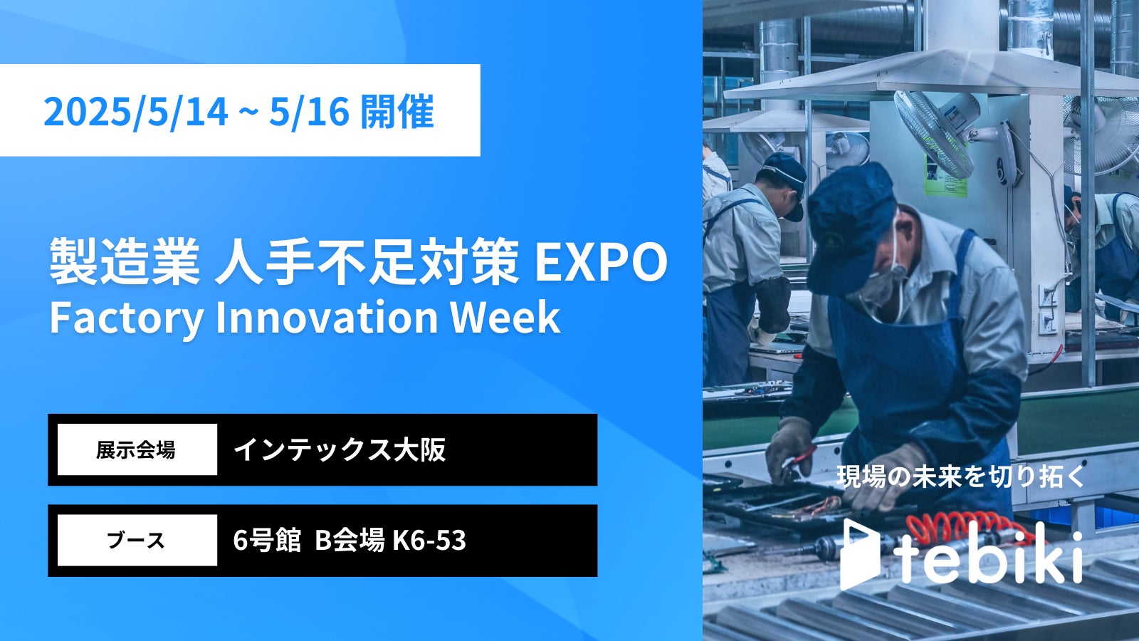デスクレスワーカー向け現場支援システムを提供するTebiki株式会社(本社:東京都新宿区、代表取締役:貴山敬 / 以下、Tebiki)は、2025年4月23日(水)から4月25日(金)まで、インテックス大阪(大阪府大阪市住之江区)にて開催される「第1回 関西 製造業 人手不足対策EXPO」に出展します。