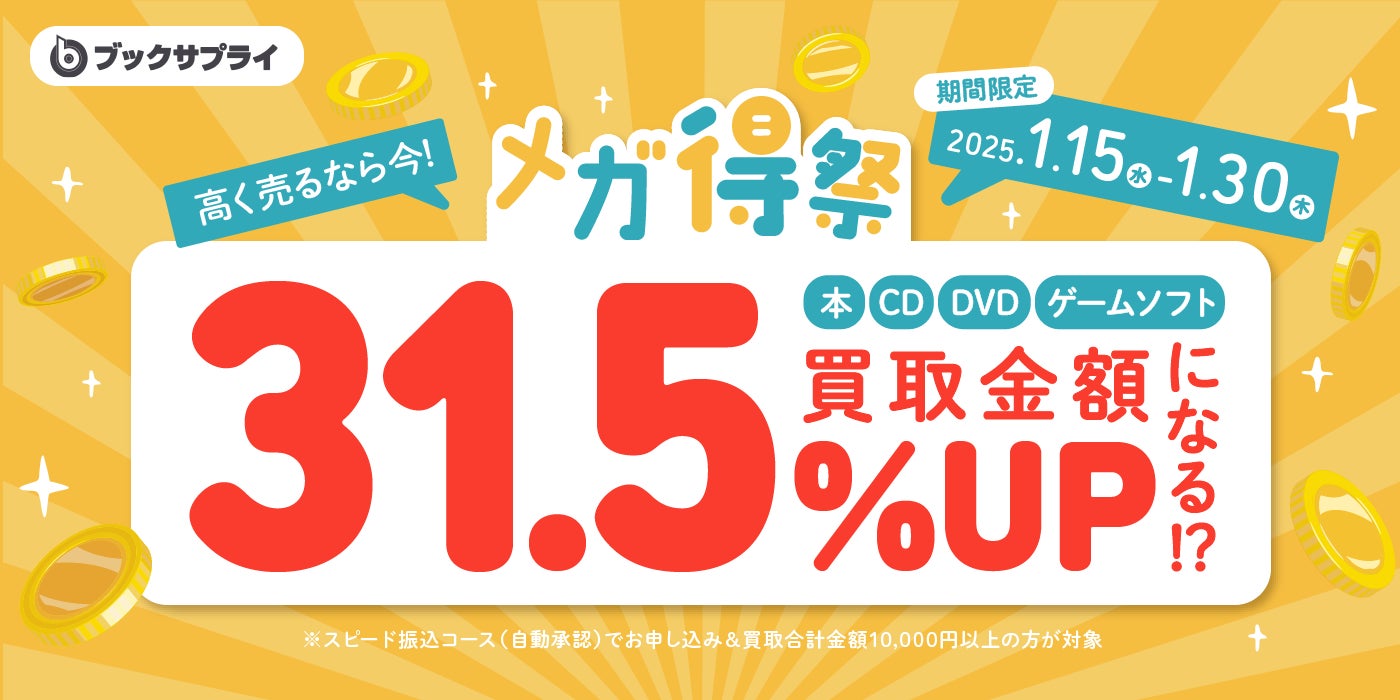 株式会社ブックサプライ(本社:大阪府吹田市、代表取締役:藪田真吾)は、「メガ得祭り」と題して、特別な買取キャンペーンを期間限定で開催いたします。本キャンペーンは、2025年1月15日(水)から2025年1月30日(木)まで実施され、買取対象全アイテムの買取金額が通常より31.5%UPいたします。本・CD・DVD・ブルーレイ・ゲームソフトなどを、よりお得に売却できるこの特別な機会をぜひご利用ください。