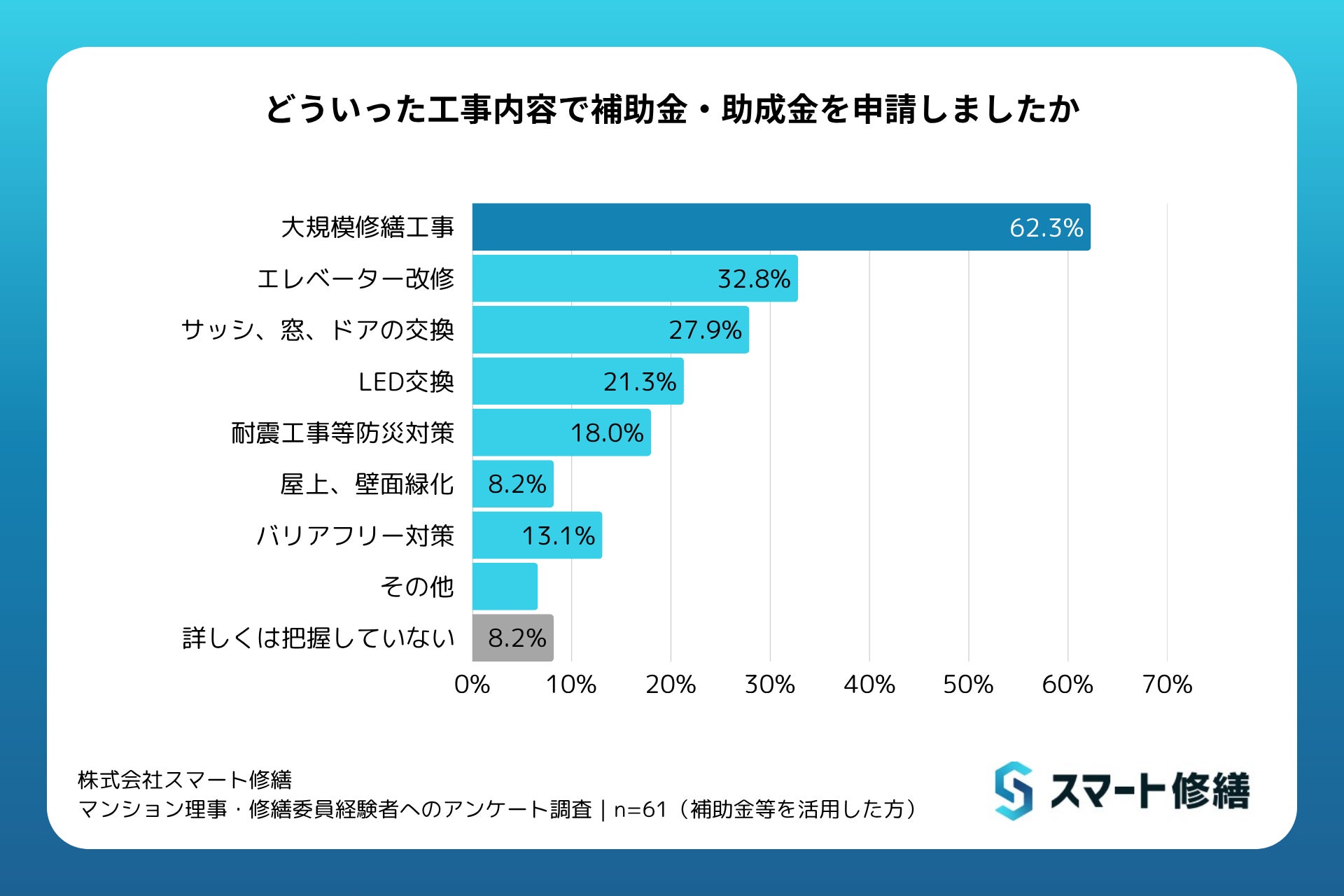 しかし、工事の負担を大幅に軽減できるはずの補助金について、実際に活用経験がある役員はわずか13.4%に留まり、過半数が「存在を知らない」まま修繕の機会を終えている。