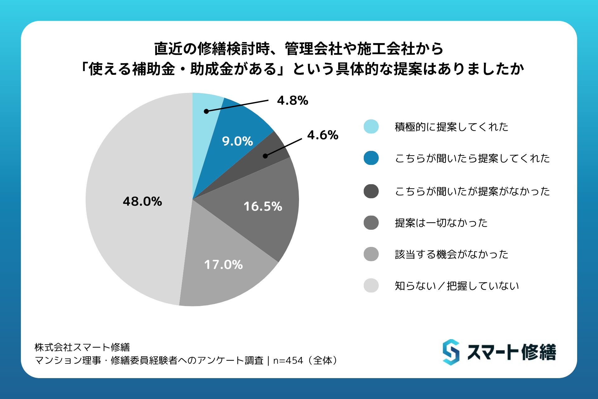 「提案は一切なかった」が16.5%、「知らない・把握していない」が48.0%と、管理会社・施工会社から自発的に補助金情報が提供されることはほぼない実態が明らかに。
