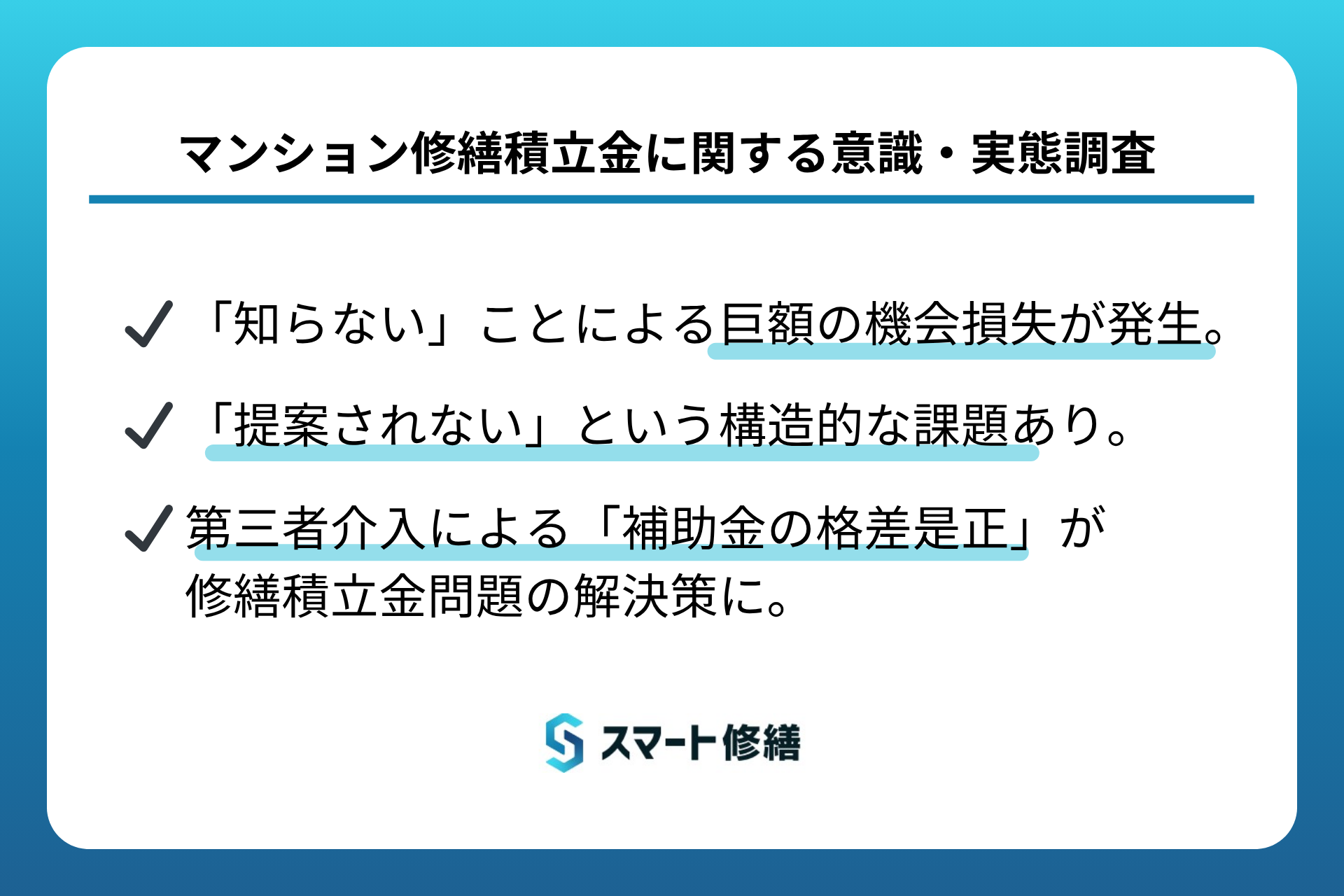 こうした背景を受け、株式会社スマート修繕は「補助金・助成金に関する正確な情報を広く伝えることが重要」と考え、管理組合理事・修繕委員経験者を対象とした本調査を実施しました。補助金の認知実態から活用状況、事業者からの提案実態、修繕積立金への不安まで、幅広い角度から理事・委員の本音を明らかにすることを目的としています。