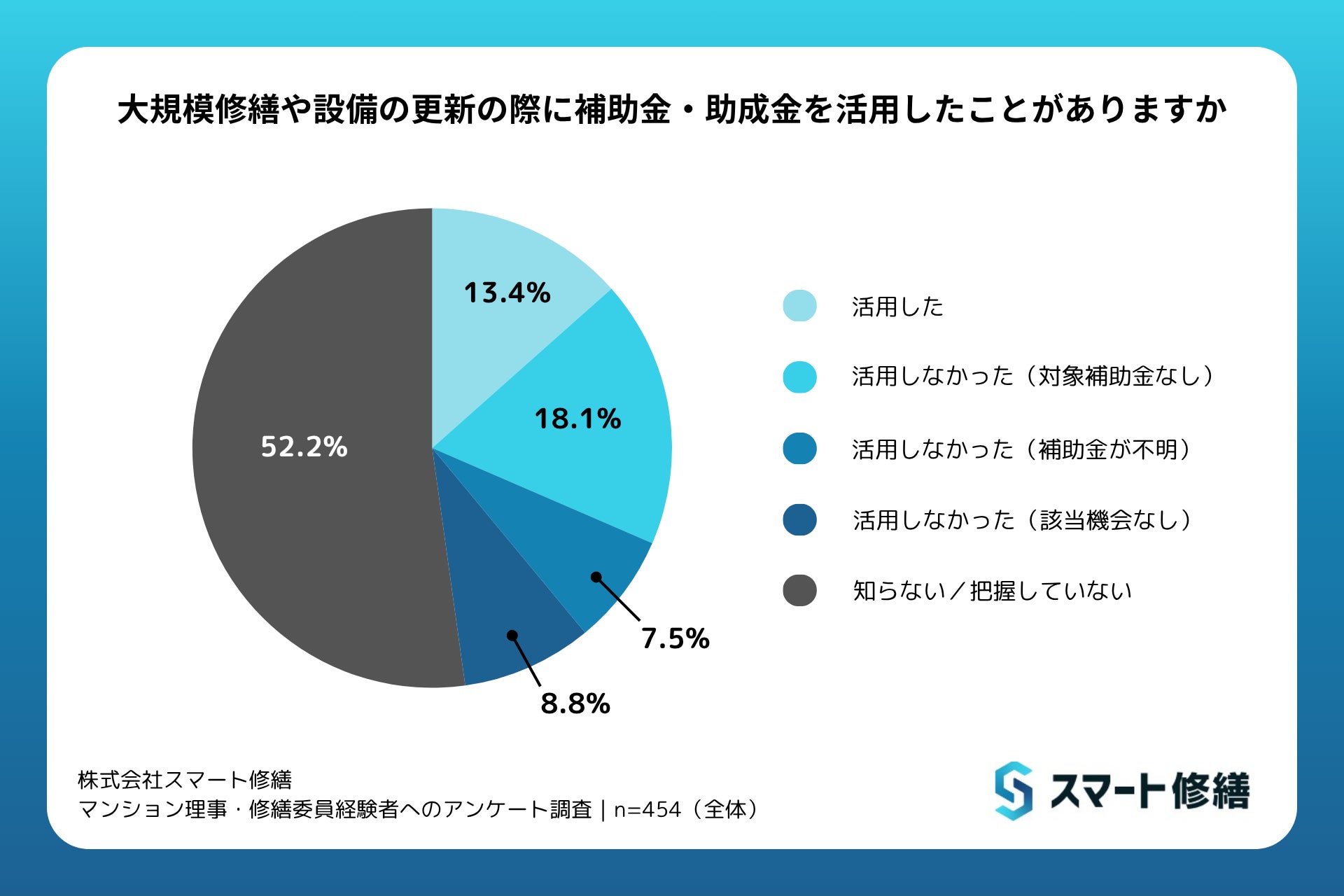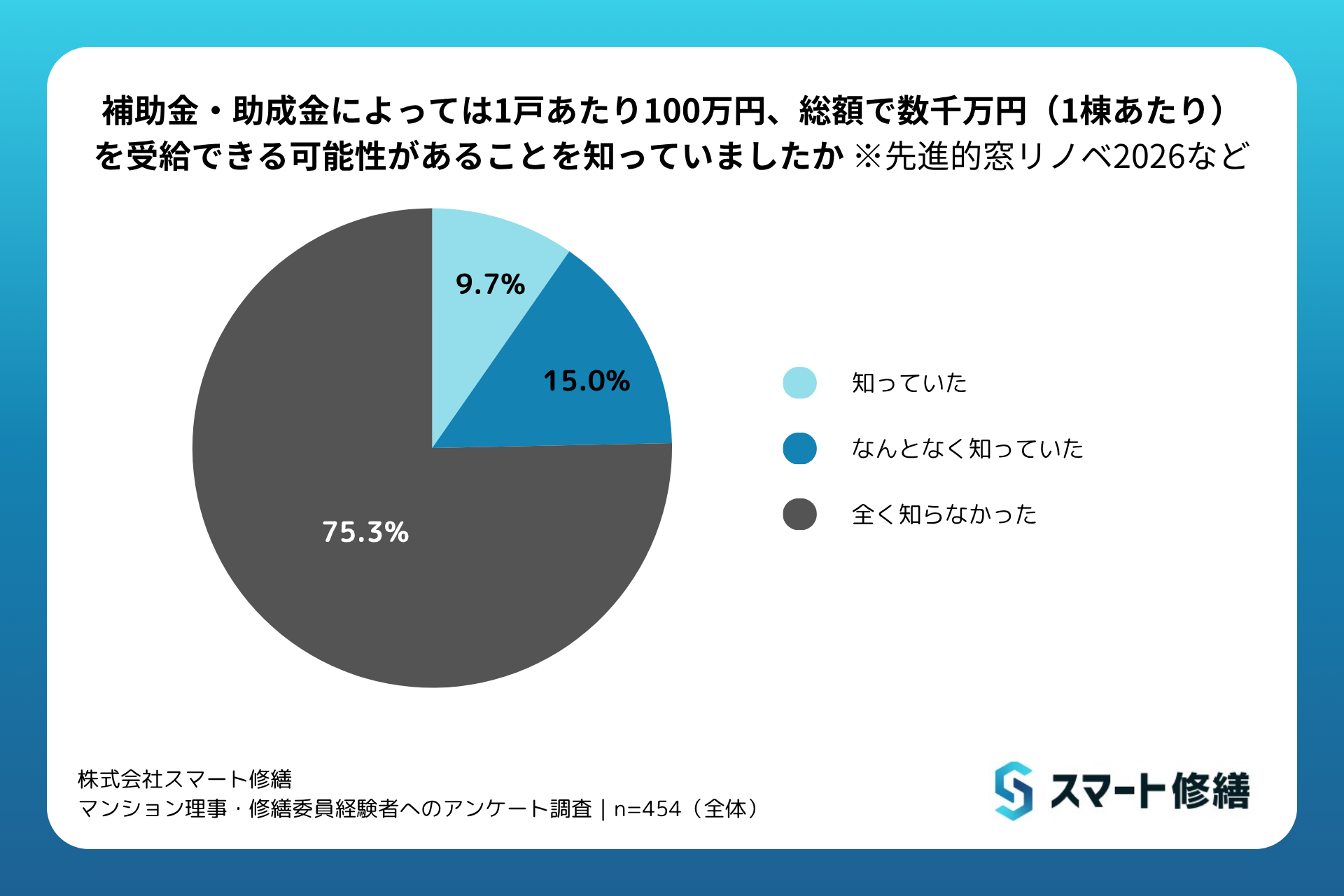 マンションやビルなど大型建物の修繕工事の見積、工事支援サービスを展開する株式会社スマート修繕(本社:東京都港区)は、分譲マンションの区分所有者かつ管理組合役員(理事・監事)経験者454名を対象に、「マンション修繕における補助金・助成金の活用実態と意識調査」を実施しました。