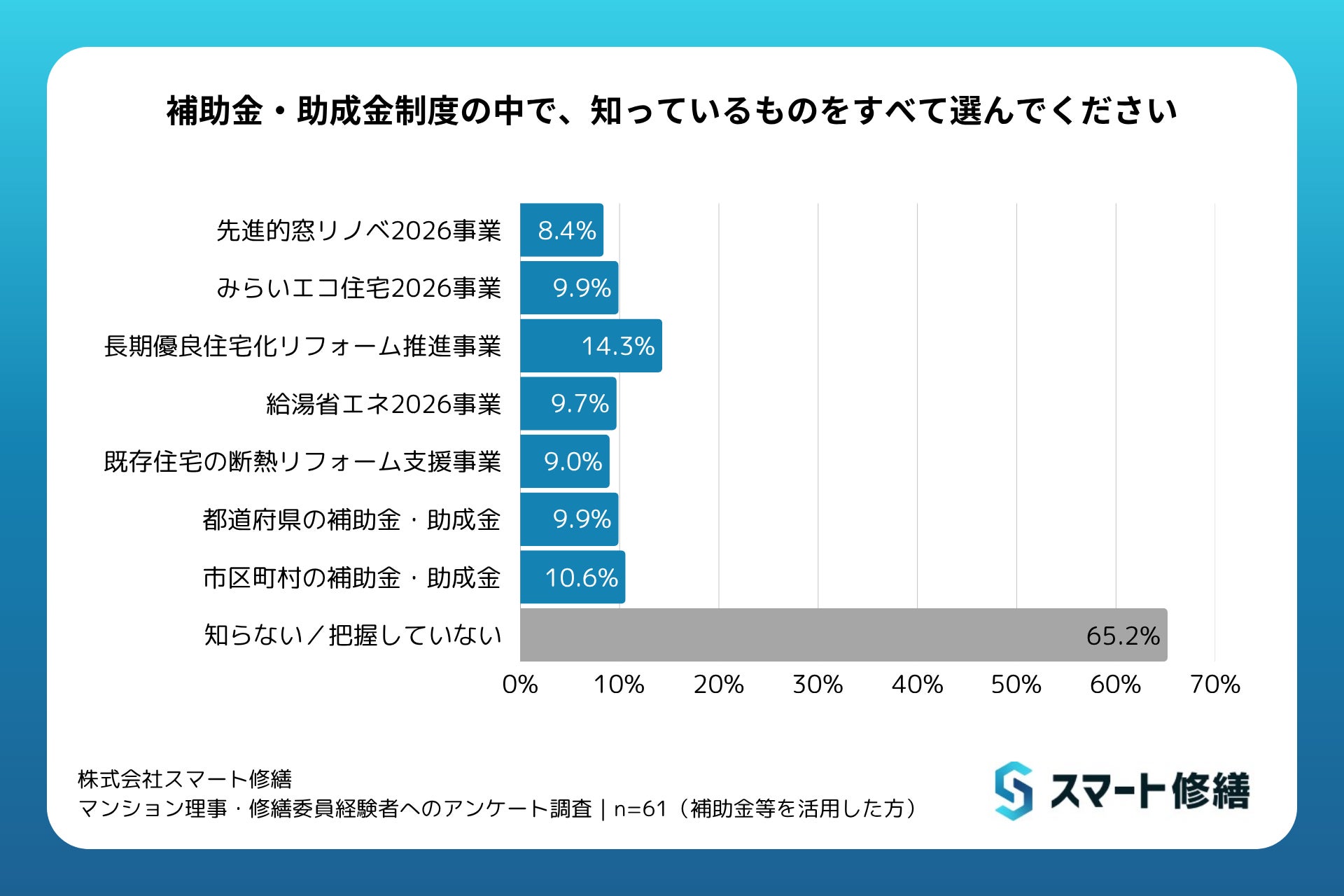 具体的な制度についてはそれぞれ10%前後の認知度に留まり、65.2%が「知らない・把握していない」と回答。国が実施している「先進的窓リノベ2026事業」(8.4%)や「給湯省エネ2026事業」(9.7%)など、活用の可能性が高い制度についても認知が非常に低い状況である。