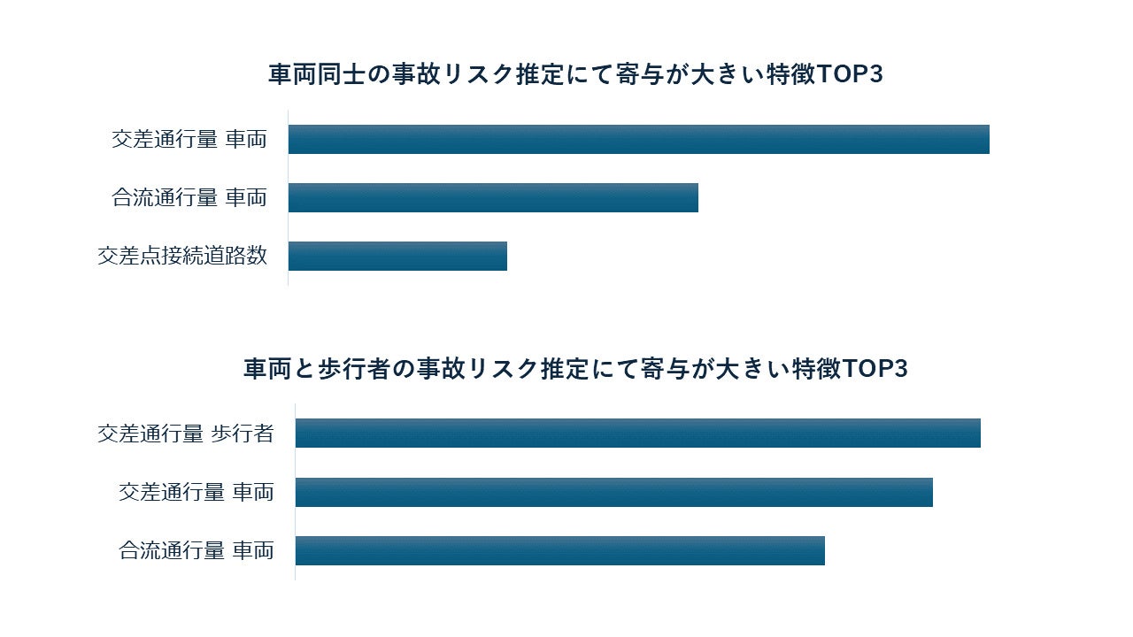 交差点リスク推定モデルにおける各事故種類のリスク推定において、特徴の寄与度を大きい順に抽出したところ、車両同士の事故、車両と歩行者の事故のいずれにおいても、交差通行量と合流通行量が高い割合で寄与していました。また、車両と歩行者のリスク推定においては歩行者に関する特徴も高い割合で寄与していました。