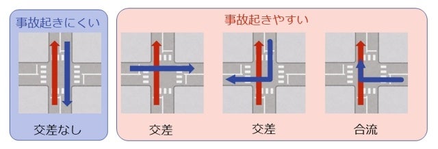 本開発により、これまで算出が難しいとされてきた、住宅街にあるような生活道路で構成される小さな交差点に対しても事故リスクを算出することができるようになりました。これにより、普段、通勤・通学等で利用する身近な道路に潜む危険な交差点を事前に把握することが可能となります。