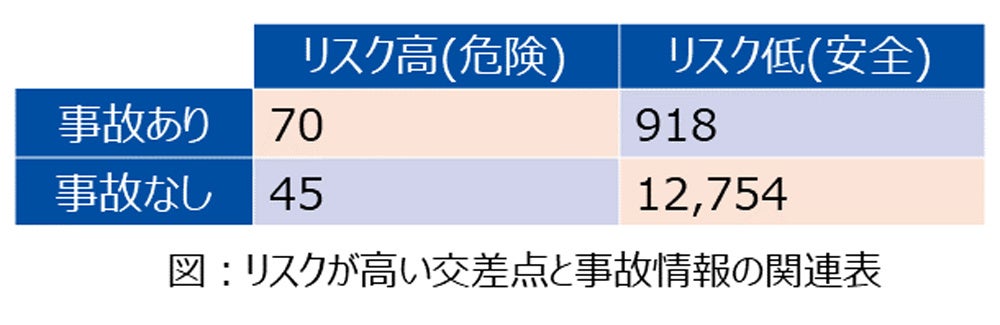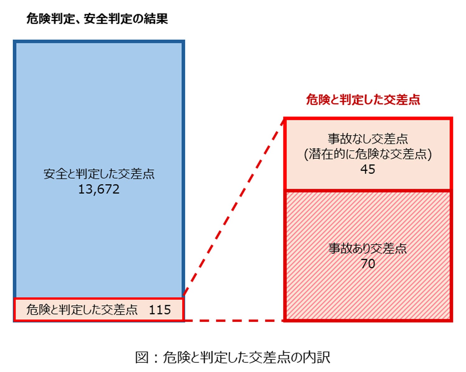 その結果、危険と判定された交差点数は115件と全体の13,787件に比べると非常に少ない件数にも関わらず、その中で実際に事故が発生していた件数は70件と高い割合で一致することが確認できました。