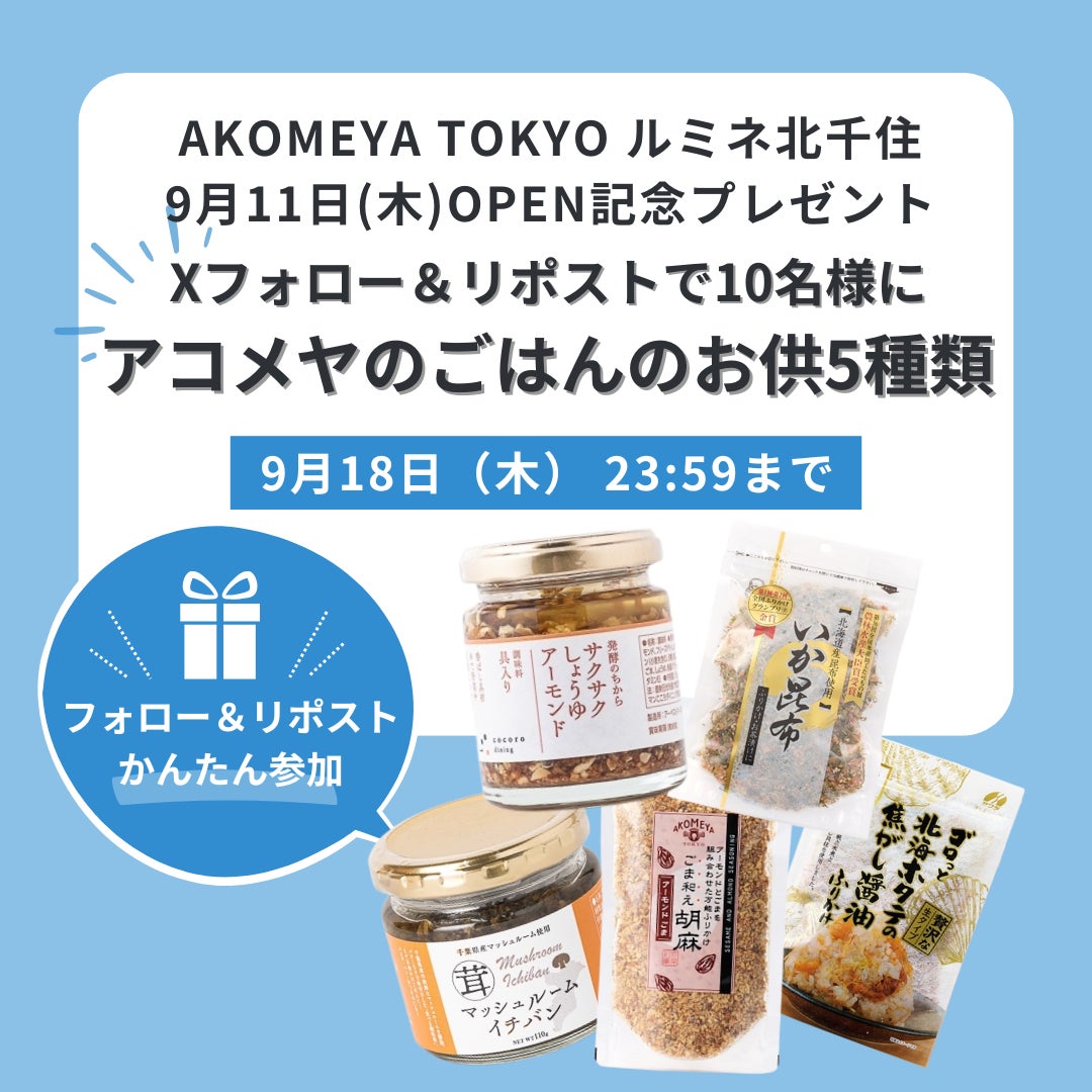 株式会社AKOMEYA TOKYO(本社:東京都渋谷区、代表取締役社長:山本 浩丈)が運営する、「一杯の炊き立てのごはんを中心に広がるおいしい輪」をコンセプトに、全国から厳選されたお米と、お米に相性抜群のご飯のお供、出汁などの食品や、食器・調理道具などを扱うライフスタイルショップ「AKOMEYA TOKYO」は、「AKOMEYA TOKYO ルミネ北千住」を9月11日(木)にオープンいたします。