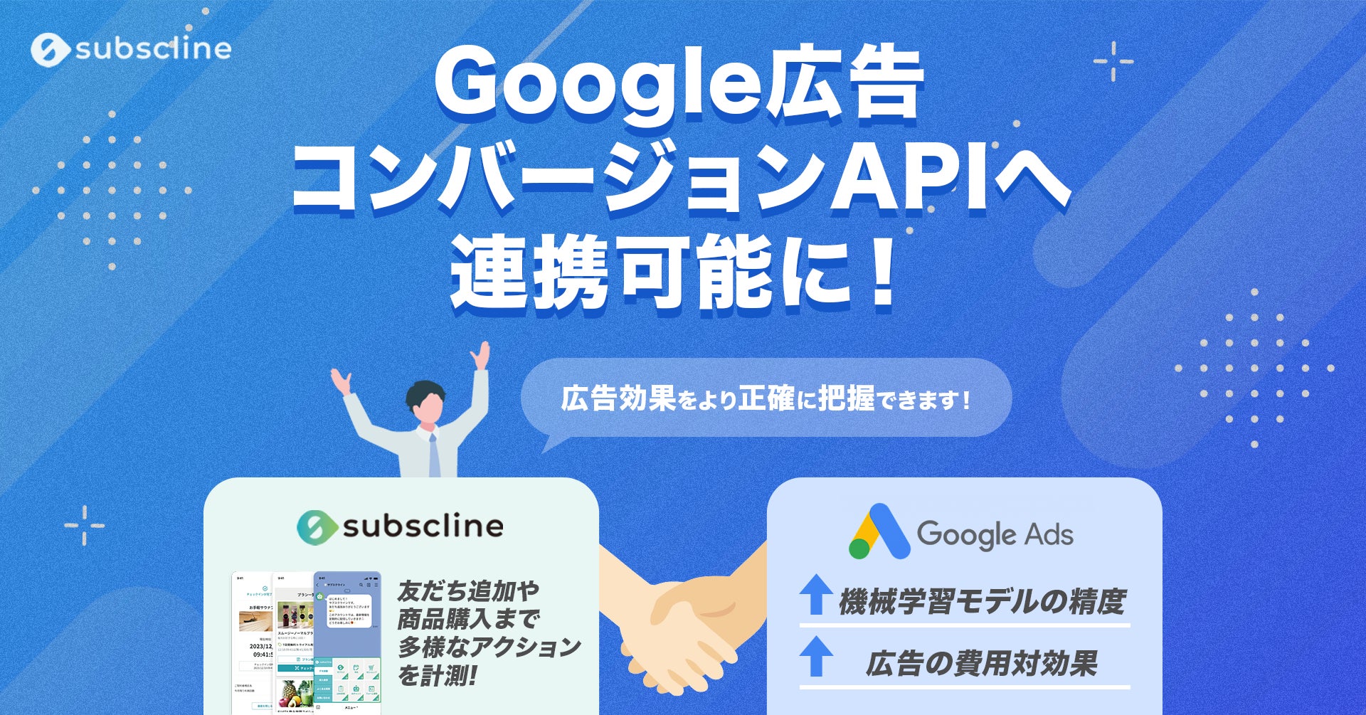 株式会社サブスクライン(本社:東京都渋谷区、代表取締役:石川勝己)は、LINEの集客から決済まで一元管理が可能なマーケティングCRMプラットフォーム『サブスクライン』について、LINEを経由したコンバージョン情報をGoogle広告コンバージョンAPIに連携する新機能をリリースしたことを発表しました。これにより、LINE友だち追加やその後の成果アクションによるコンバージョンを計測し、広告効果を正確に把握することができます。
