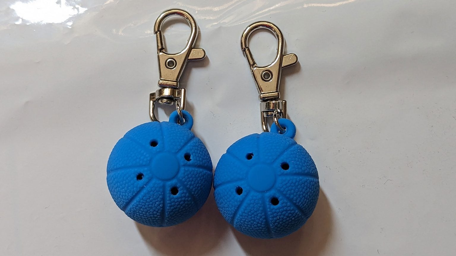 本物のゴールボールの 8 分の1(直径約3 cm)というミニチュアサイズで、中には鈴が2つに入っています。本物と同様のゴム製、表面のざらつき感や溝にもこだわったキーホルダーです。