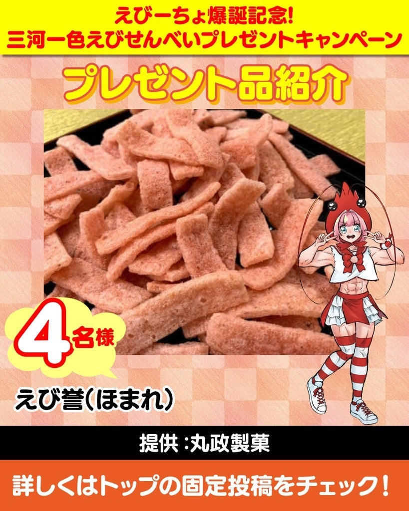 西尾市ふるさと納税応援アンバサダー第三のキャラ「えびーちょ」の誕生を記念して、特許庁の地域ブランド認定の「三河一色えびせんべい」を12名様へプレゼントするキャンペーンを開催中!