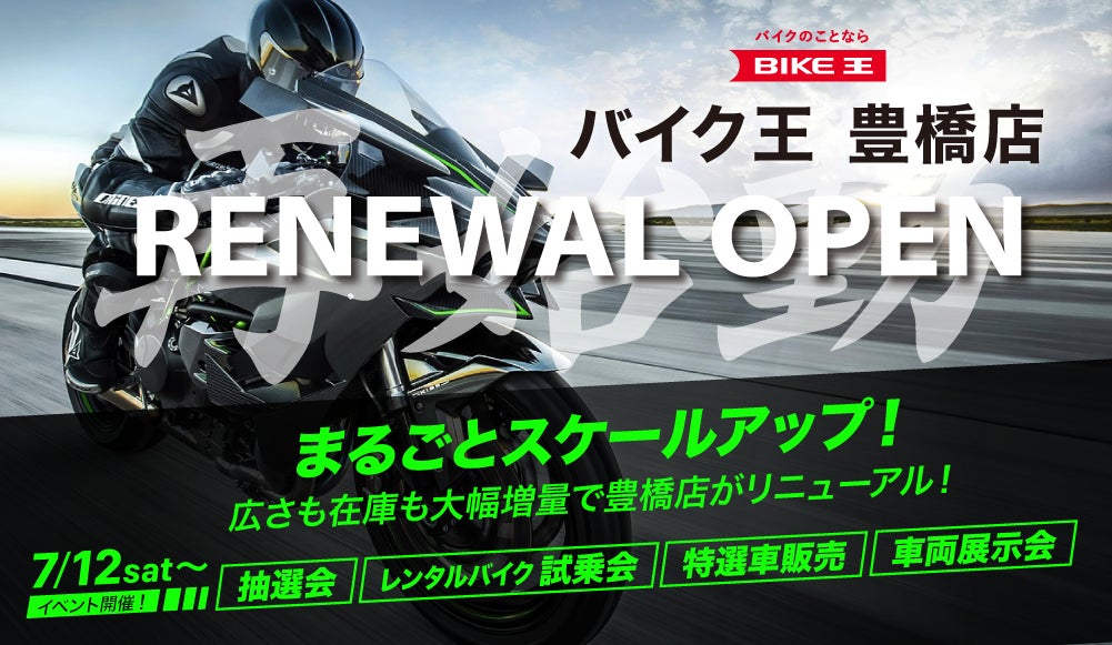 「まだ世界にない、感動をつくる。」をコーポレートミッションに掲げ、ビジョンである「バイクライフの生涯パートナー」の実現に向けて、事業を展開する株式会社バイク王&カンパニー(代表取締役CEO:澤篤史、本社:東京都世田谷区、証券コード:3377、以下「当社」)は、バイク王 豊橋店のリニューアルオープンを記念して7月11日(金)より特選車販売、7月12日(土)から7月13日(日)の2日間、豪華抽選会や試乗会などを実施いたします。