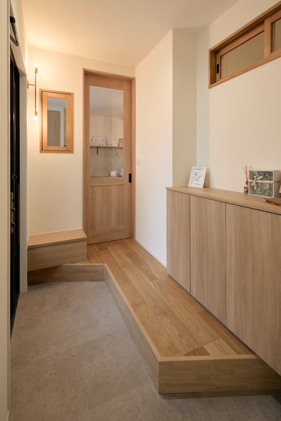 採光と通風を考えた室内窓、最大限の高さを確保した建具が、開放感を演出。滑りにくい床材を選び、愛犬も安心して自由に過ごせる住まいになっています。