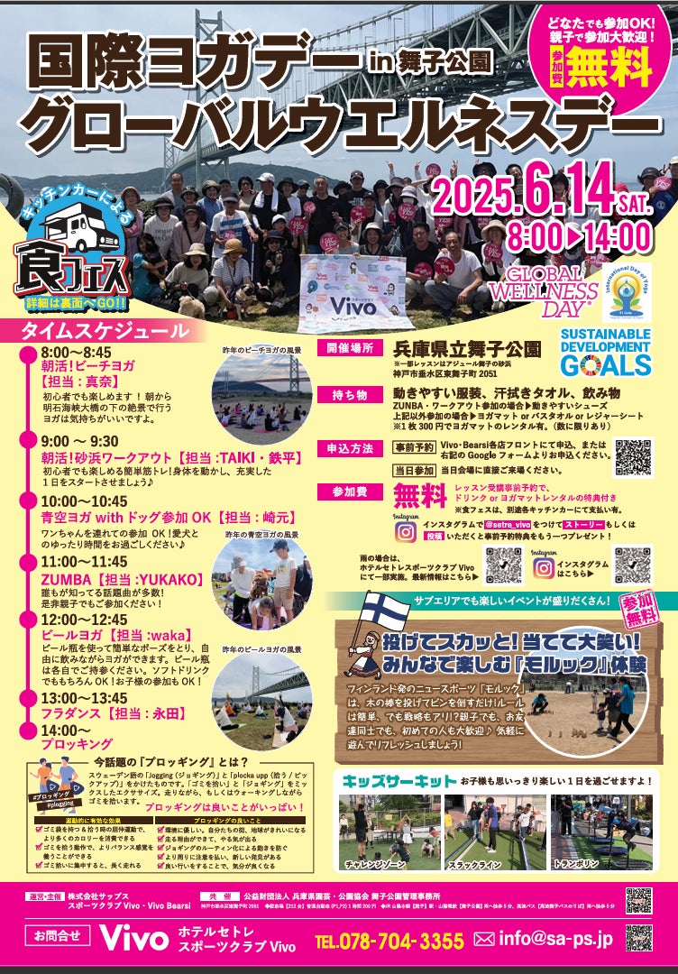 株式会社サップス(本社:兵庫県西宮市、代表取締役:中瀨 敏和)は、2025年6月14日(土)、神戸市・兵庫県立舞子公園および大阪府門真市のBears大日ショッピングモール屋上にて、地域の健康と幸せを願うウェルビーイングイベント『Vivo国際ヨガデー×グローバルウェルネスデー2025』を開催いたします。