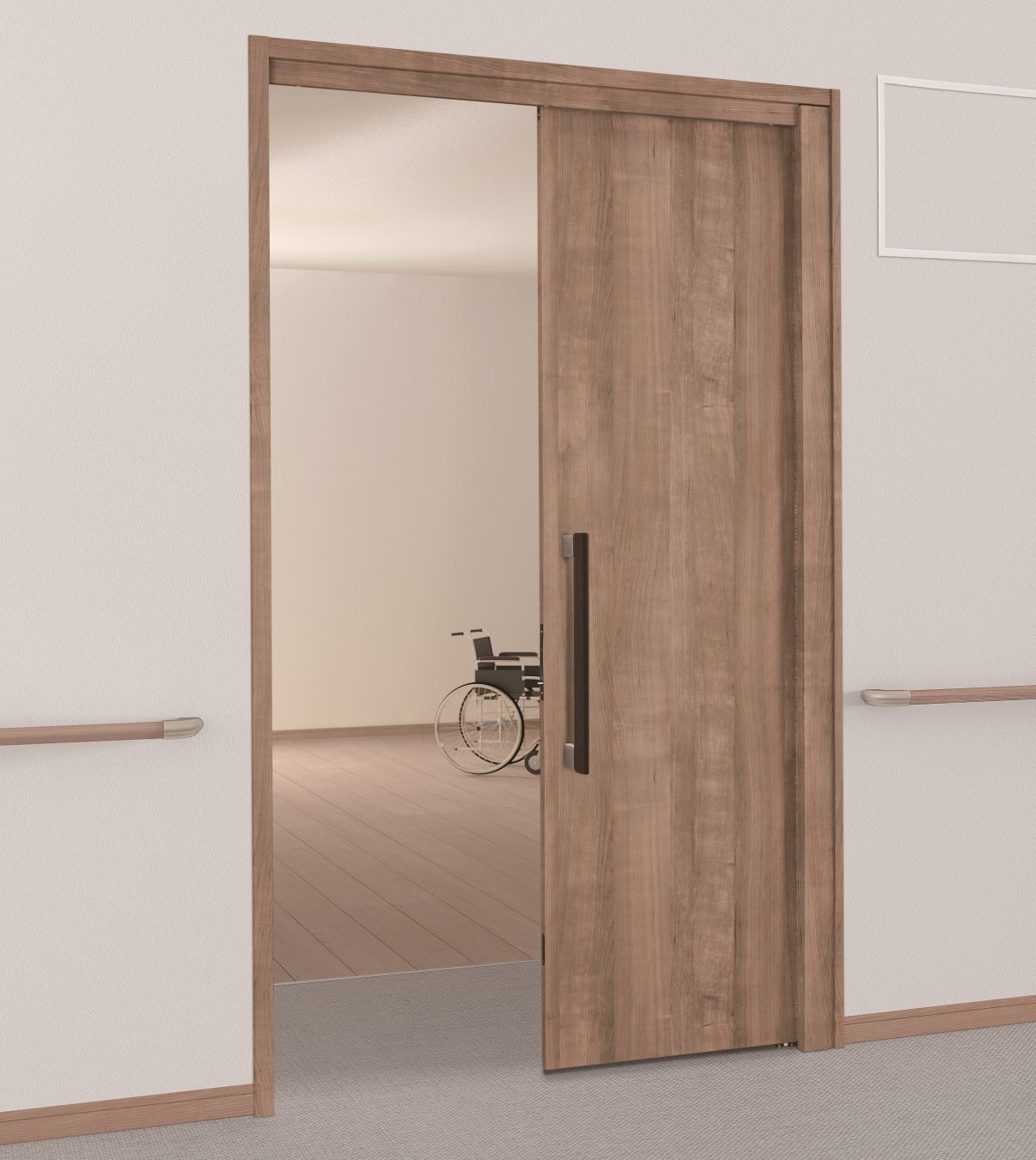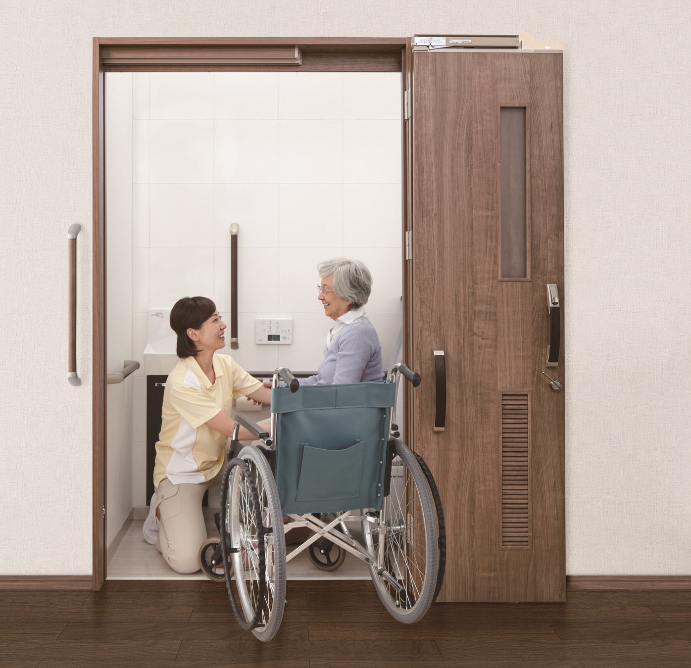 『OMOIYARI ひきドアW』は、車いすでの入室や介助をラクにすることができる業界初の開閉機構のドア。もともとは住宅向けに開発された製品ですが、扉表面の抗菌・抗ウイルス標準仕様化、金具の耐久性向上などを図り、施設でも対応可能なドアになりました。