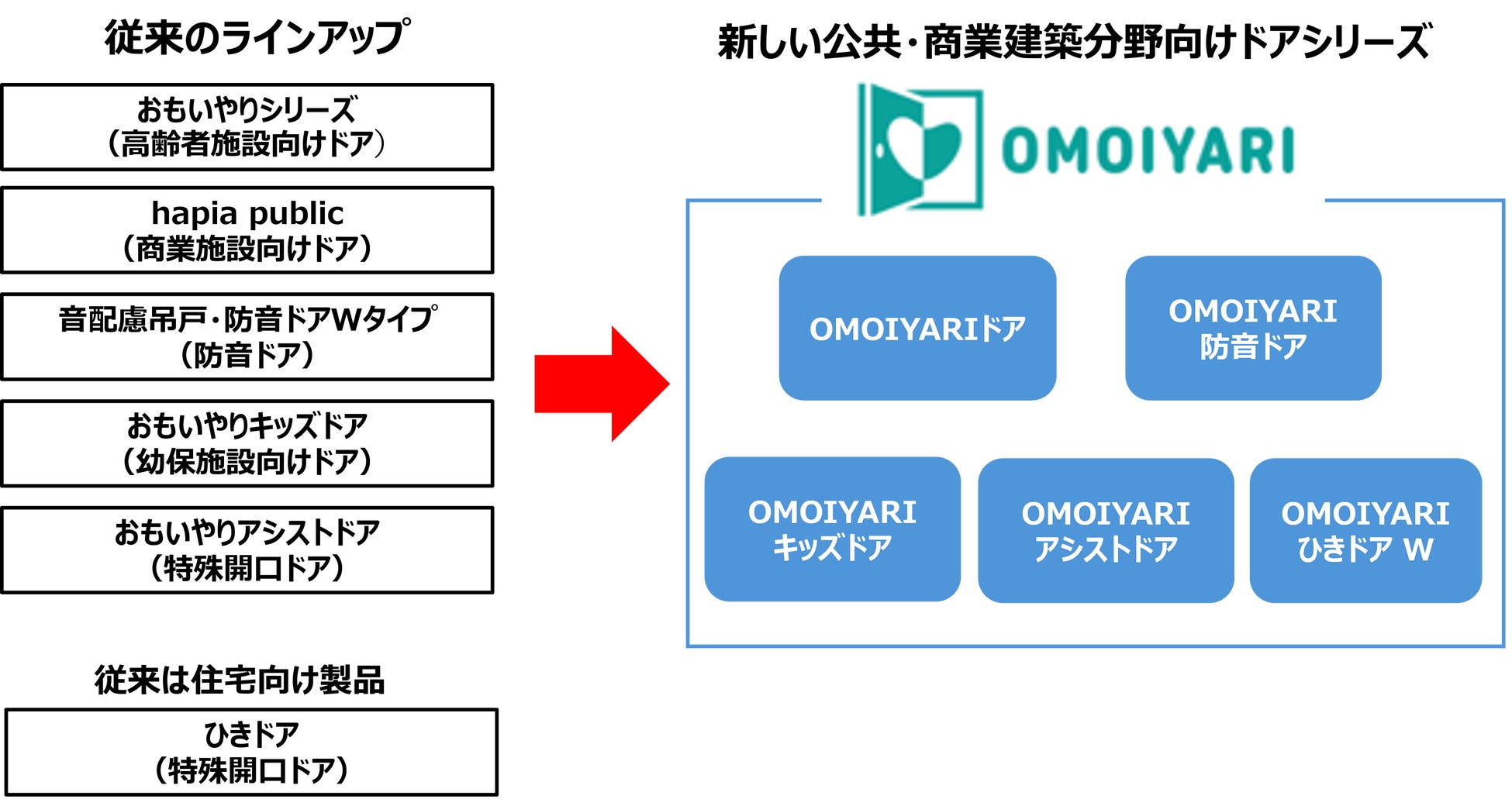 同分野においては、施設ごとに求められるドア機能が異なるとの認識のもと、これまで当社では施設や用途に特化した複数のシリーズを設定しておりました。しかし、販売実績を重ねていく中で、ドアの機能・性能には、複数の施設に共通して求められるものもあることがわかり、この度、既存の各ドアシリーズを統合し、公共・商業建築分野向けの新たなドアシリーズとして、『OMOIYARI』シリーズを立ち上げました。