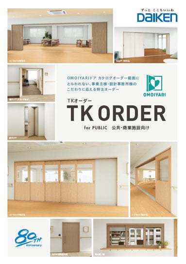 当社の強みである高い特注対応力を訴求するために、パンフレットを新たに発刊いたしました。カタログの特注範囲にとらわれず、事業主・設計事務所の方のこだわりにお応えします。造作建具を使用せず、『OMOIYARI』シリーズの豊富な品揃えとともに、施設の空間づくりをまるごとお任せいただけます。