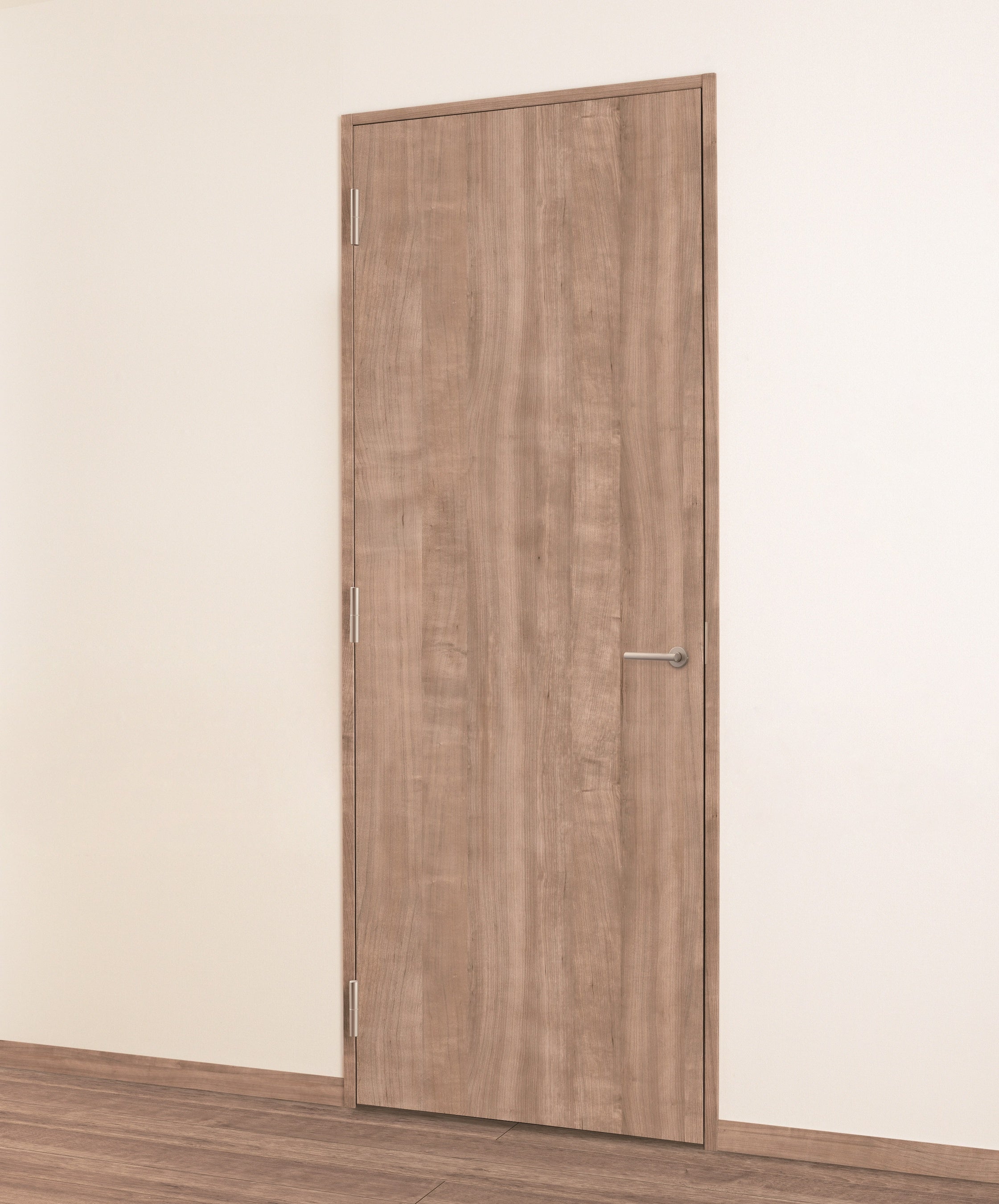 高齢者施設等では、車いすやキャリーワゴン等がドア枠にぶつかってしまうことが多く、傷やへこみの原因となります。これまでも、傷・破損に強いスチール枠をラインアップしていましたが、今回、特に破損が起きやすい戸先側のみをスチール基材とする枠を追加しました。戸先側以外は木製枠のため、全てスチール枠にするよりも、コストを抑えることが可能です。また、スチール基材の部分にも木製枠と同じ木目のシート化粧を施しているため、意匠性を損なわずに、ドア枠の強度を高めることができ、かつ施工現場での塗装やシート貼り工程も削減できます。