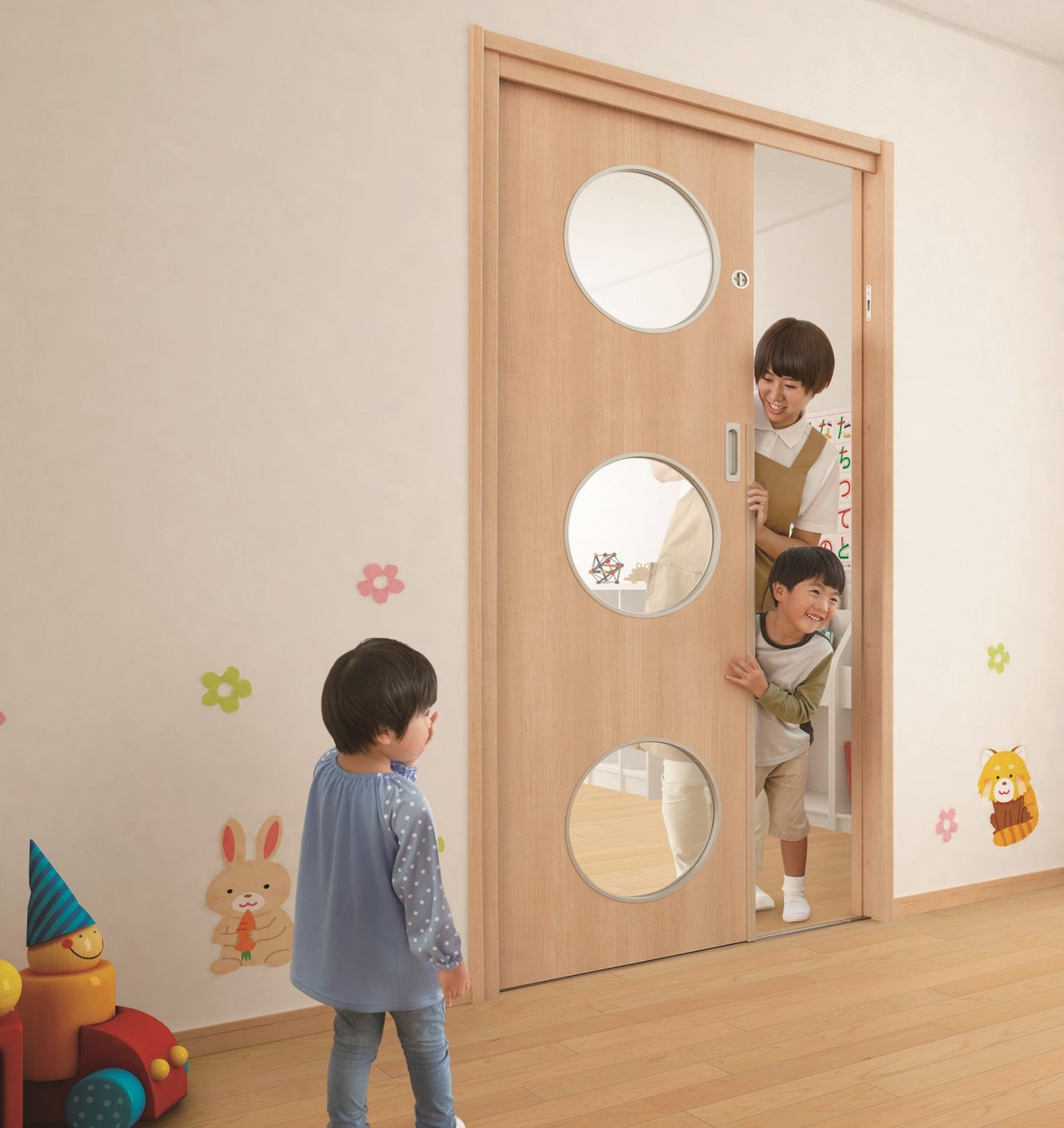 幼保施設向けのドアです。足元が見える窓デザインや子どもの指はさみ防止機能など、子どもの安全に配慮しています。