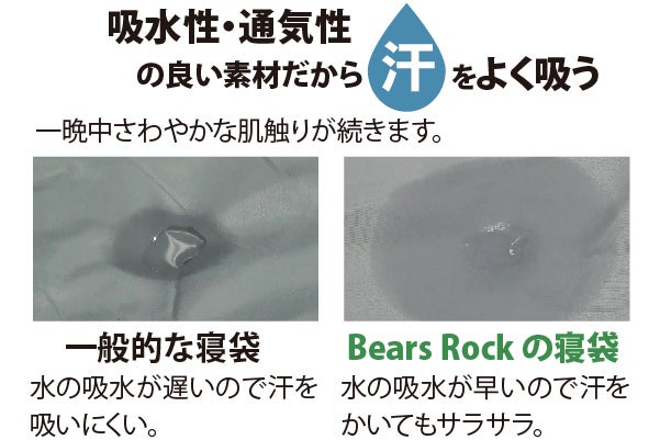 吸水性・通気性の良い素材なので一般的な寝袋よりも水の吸水が早く、汗をかいてもサラサラです。