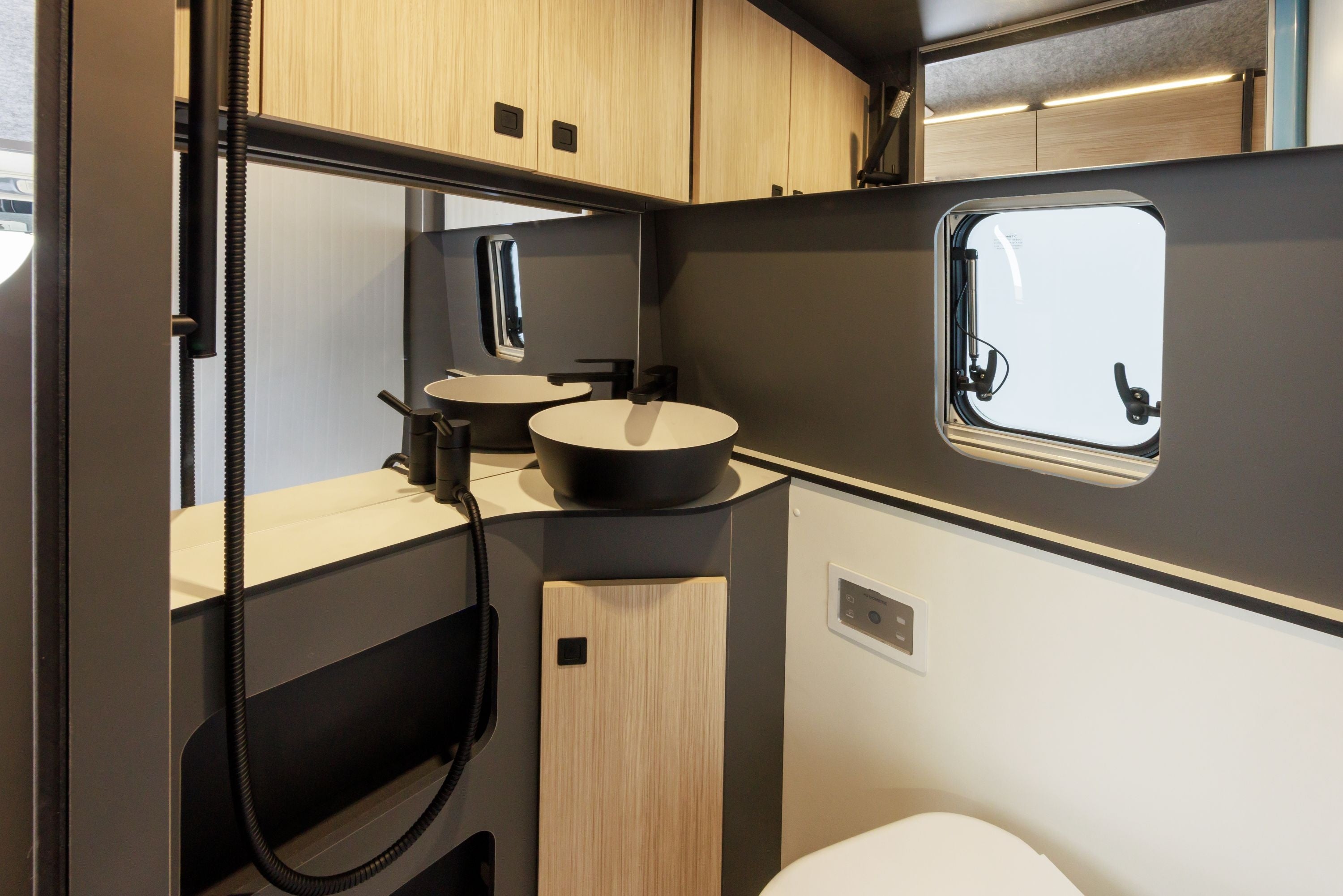 「回転式フロントシート、広いトイレルーム、処理の手間がないクレサナの装備、そしてリヤの常設ベッド。どれも夫婦旅にちょうど良いサイズ感です。」