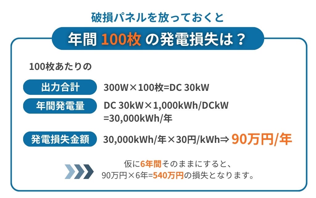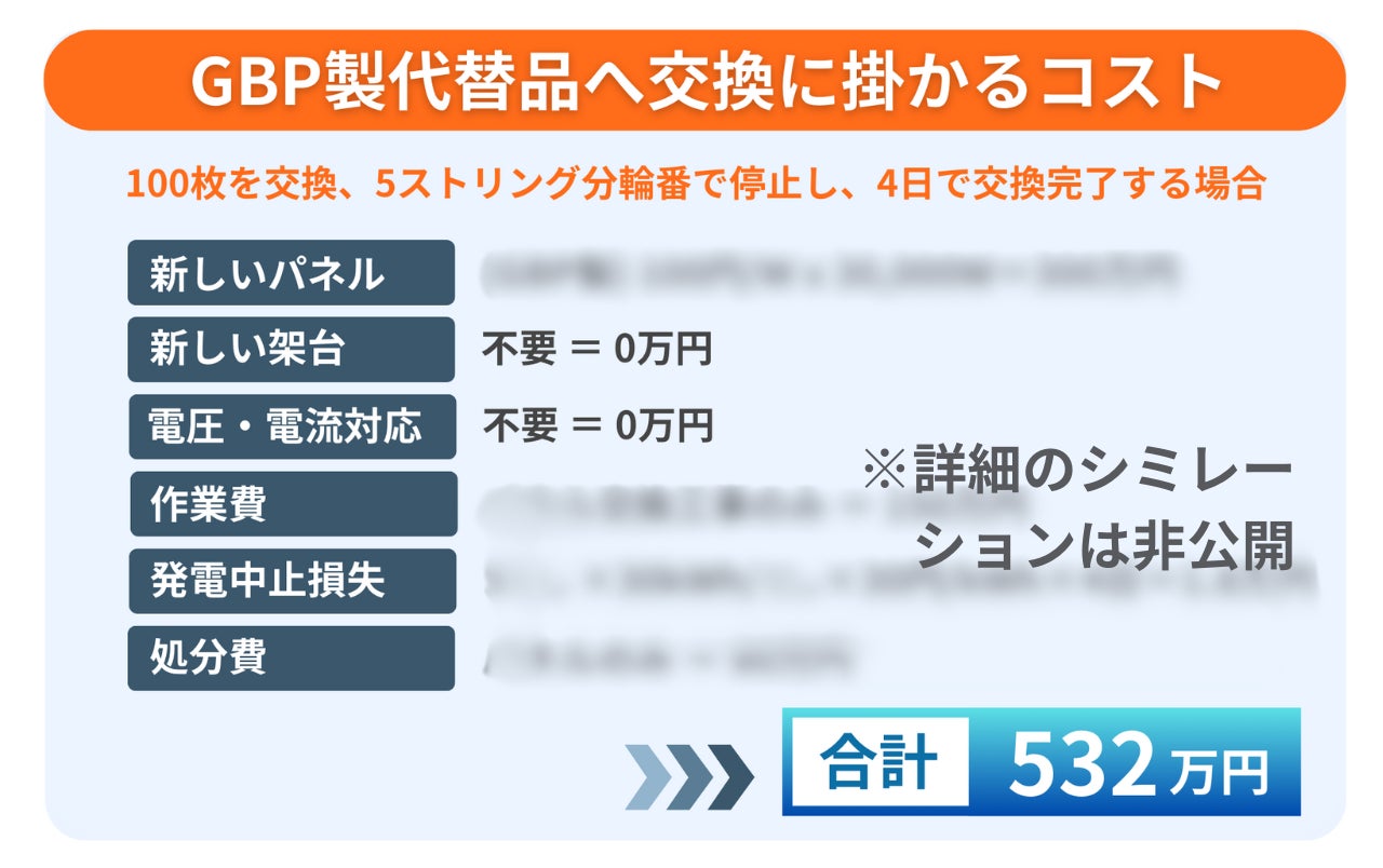 なお、6年放っておくと発電損失額が540万円と、旧型番太陽光パネルの代替品へ交換と同額です。6年放っておくより、GBPの旧型番太陽光パネルの代替品に交換した方が賢い選択に!!