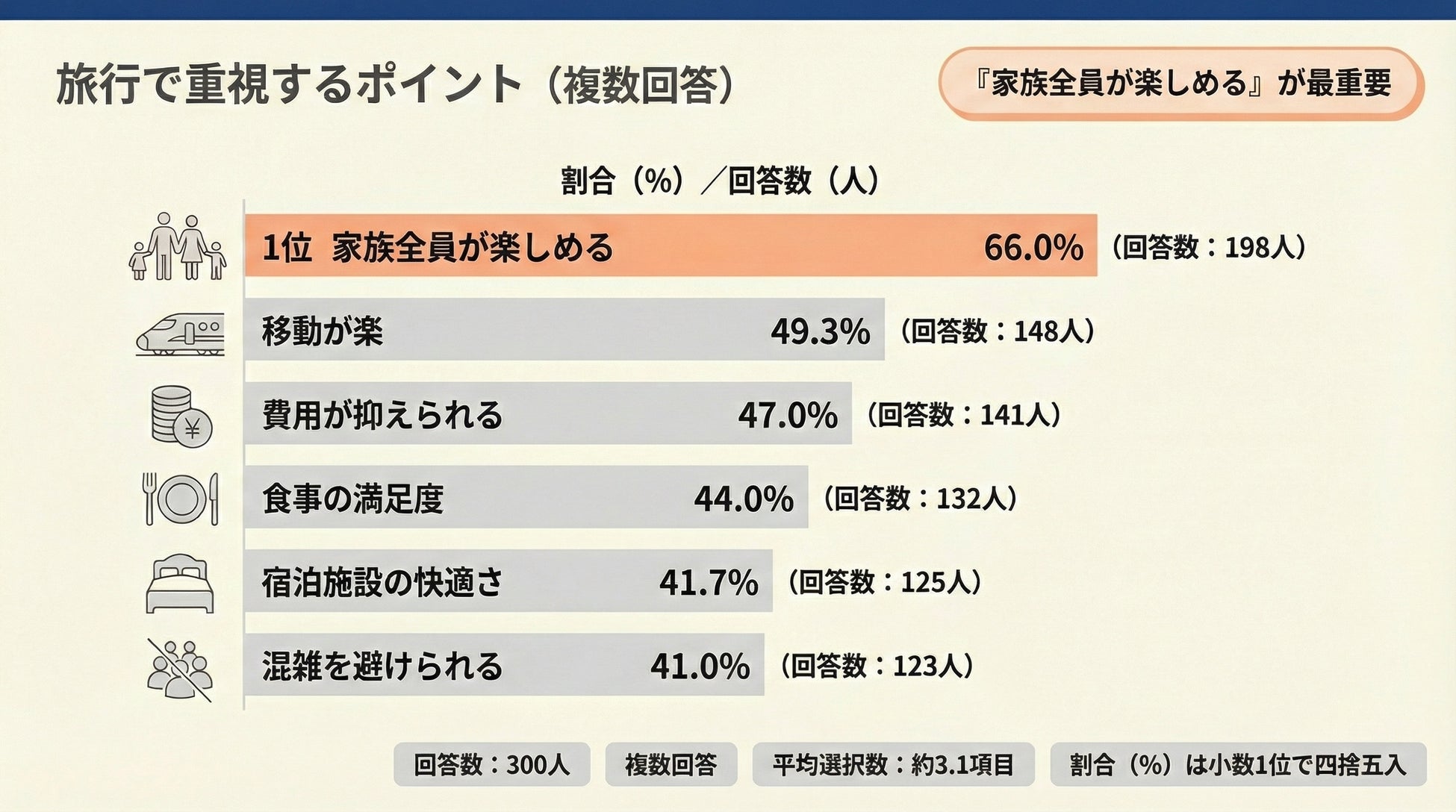 【結果6】重視ポイント1位は家族全員が楽しめる66.0%(198人)。移動の楽さと費用が続く