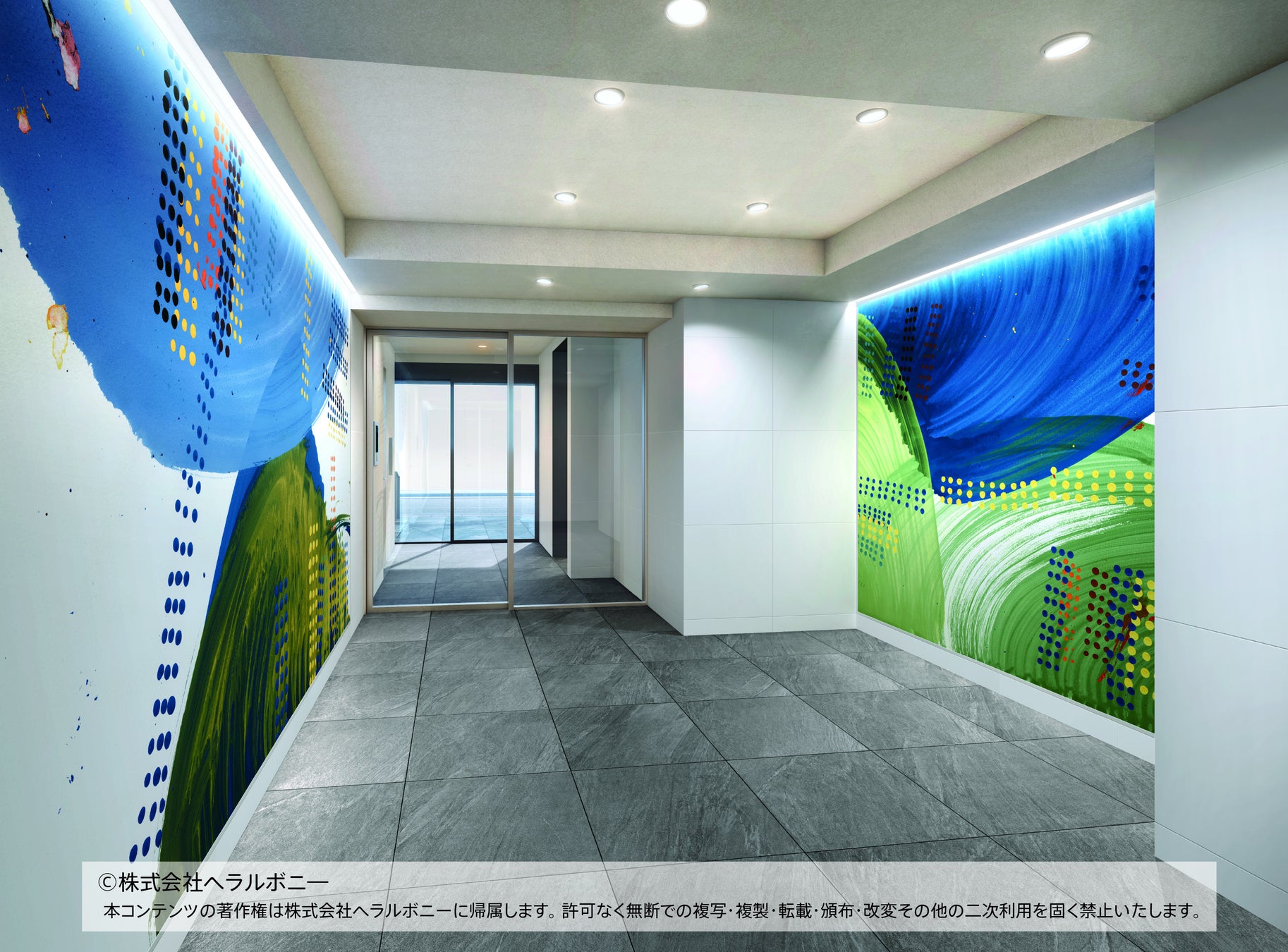 エントランスに、ヘラルボニーの契約作家水上 詩楽(みずかみしがく、滋賀県・やまなみ工房在籍)氏の作品を大胆に取り入れています。アート×建築の融合を実現し、唯一無二の付加価値を持たせました。