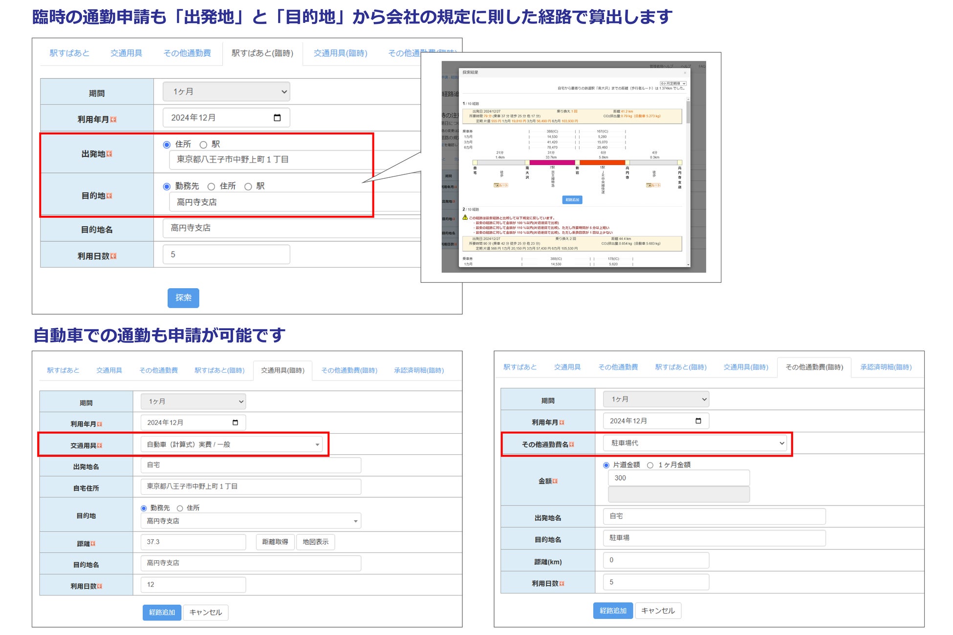 「臨時勤務先申請」機能でもこれまでの特定の通勤経路の登録と同じように、出発地と目的地を入力するだけで、会社の規定に則した合理的な経路を「駅すぱあと」にて算出します。これにより、従業員が1つずつ経路を調べ直したり、申請後の承認フローで1経路ずつ規定に照らし合わせてチェックする手間が削減され、業務が効率化されます。また、公共交通を利用した通勤だけでなく、自動車を利用した申請にも対応しており、駐車場代も申請できます。