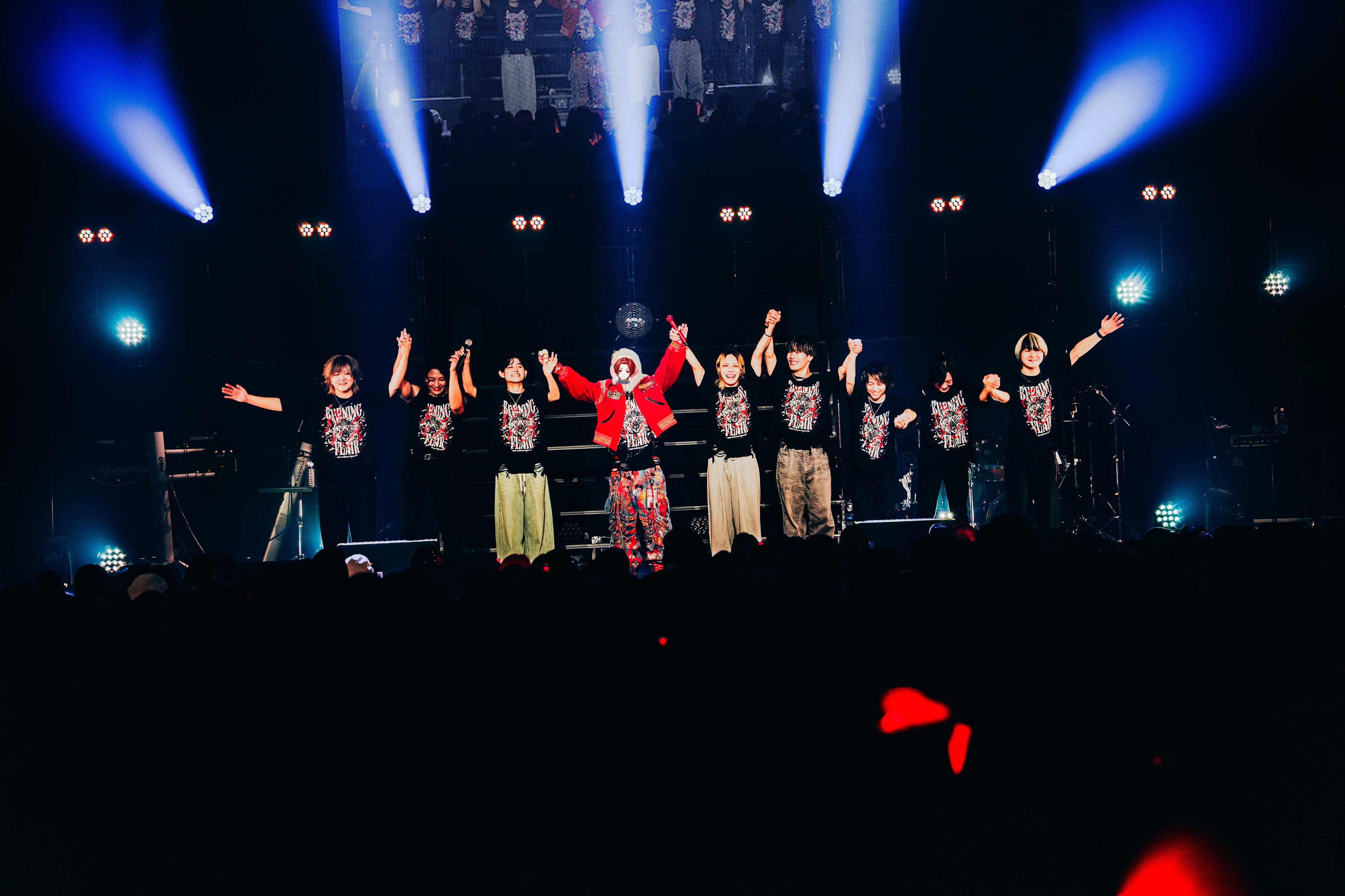 再びのMCでは、りうらの「なんとスペシャルゲストの方が来てくれています。VOISINGメンバーじゃありません」という告白により、場内は騒然とした雰囲気に。一呼吸置いてTani Yuuki氏とまらしぃ氏が呼び込まれると、さらに大きな喝采が豊洲PITを埋め尽くした。今年8月に行われたYouTubeでのコラボレーションをきっかけに、今回の共演が実現。予想の斜め上をいくゲストの登場に、りうっこの興奮も凄まじく、すっかりゲストのふたりも圧倒されている様子だ。会場が温かな空気に包まれるなか、動画でも披露した「W/X/Y」へ流れ込んでいった。降り積もるように重なるピアノと声は穏やかで、胸の奥にグッと迫りくるものがある。繊細な感情の機微を捉えているからこそ、圧倒的な説得力もあるのだろう。あまりにも美しい共演に、オーディエンスはサイリウムを振るのも忘れ、吸い込まれるように聴きいっていた。