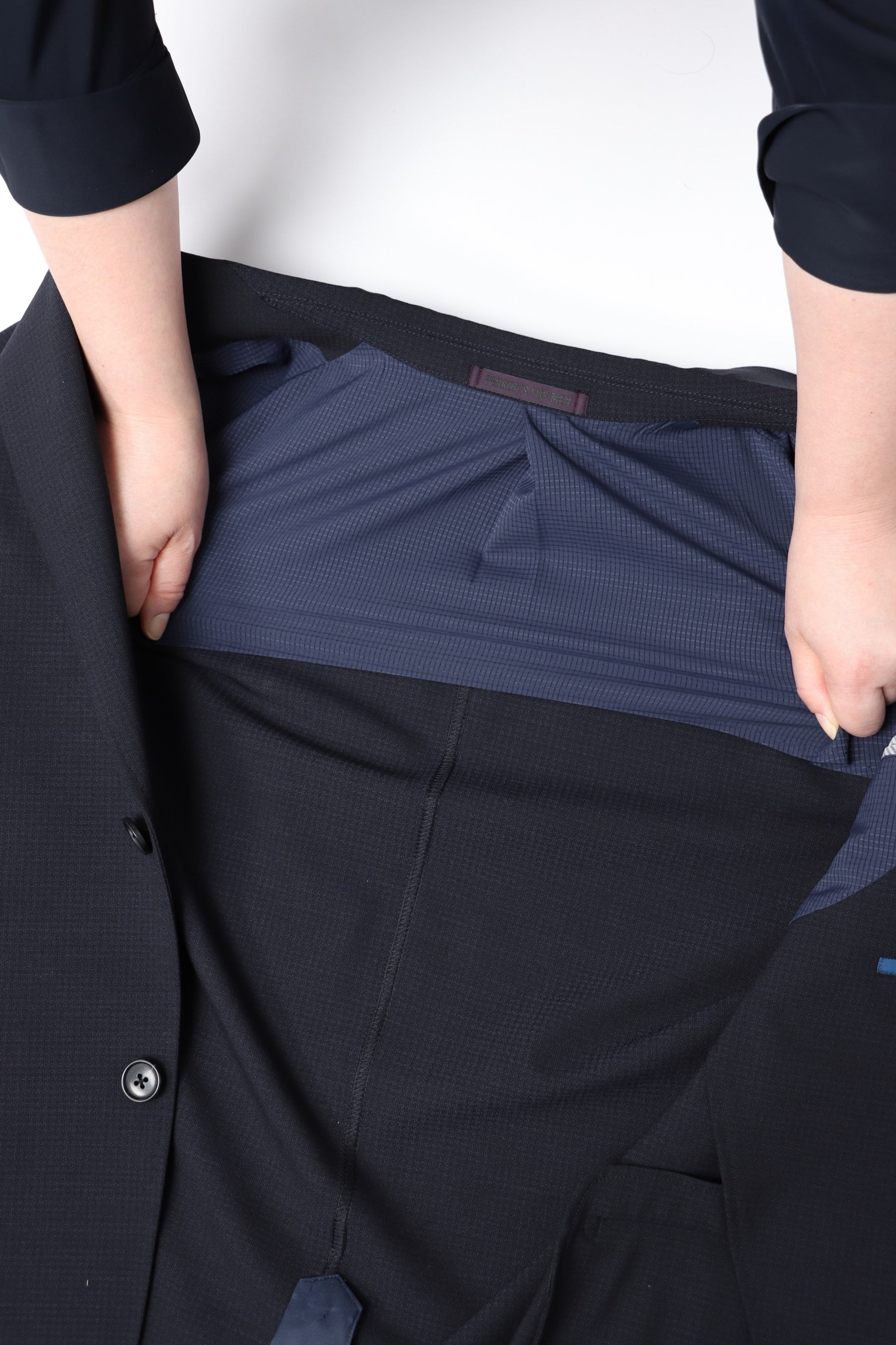 昨今のビジネスウエアの多様化に伴い、市場にはストレッチ性のあるセットアップスーツが増えています。お客様からは、機能はそのままでカッチリとしたデザインを要望する声も多くあがっていることから、見た目は通常のスーツでありながら、中身はストレッチ性に優れたスーツを企画しました。本企画最大のポイントは、従来の基準(当社比)を大きく上回るストレッチ性で、横方向1.25倍、縦方向1.2倍、斜め方向1.5倍の伸長率を備えています。この全方向へのストレッチは、生地規格の段階からどんな動きでも対応できるように、緯糸(よこいと)や経糸(たていと)の長さや本数の調整を繰り返し行い、伸長率の高いポリウレタンを組み合わせることで驚異のストレッチ性を実現しました。