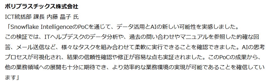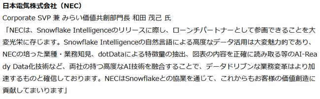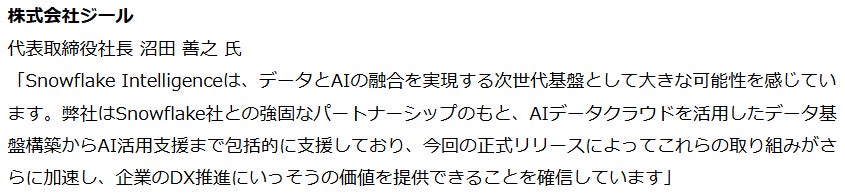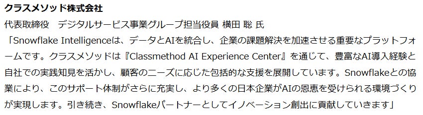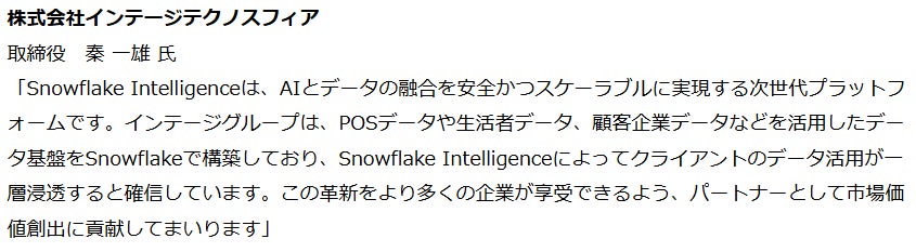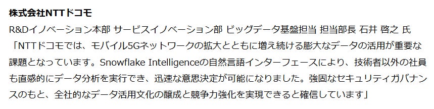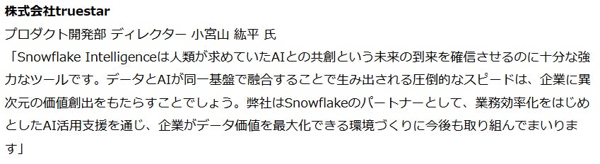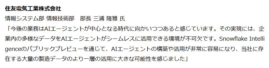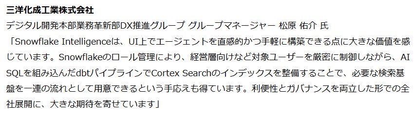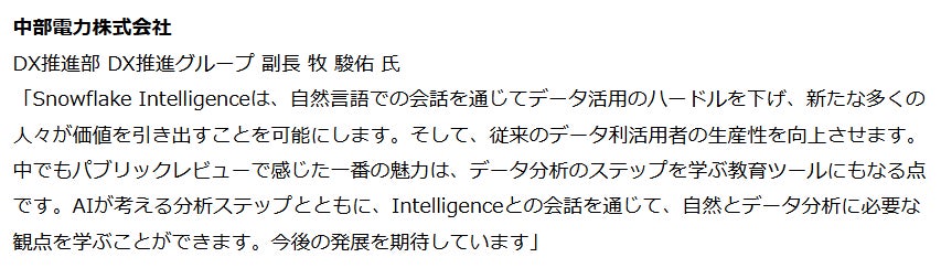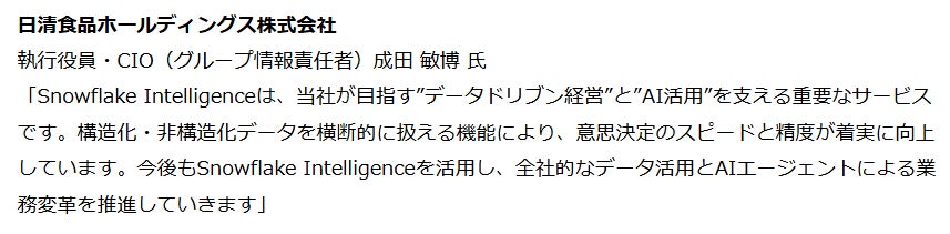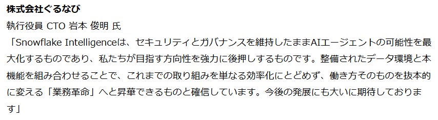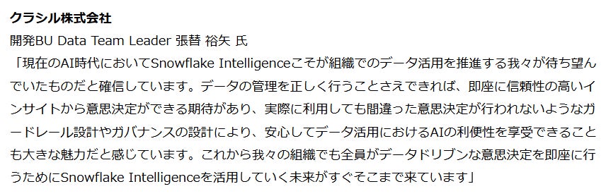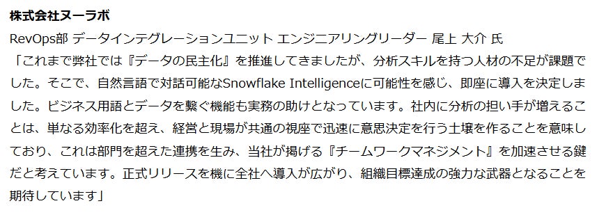 この他にも、様々な業界の企業がSnowflake Intelligenceの導入を進めており、業務効率化とデータドリブンな意思決定の実現に向けた取り組みを加速させています。その代表的な事例として、以下の企業からもコメントをいただいています。