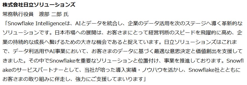 「日本企業では今、データとAIの活用が競争力強化の鍵となっています。Snowflake Intelligenceは、自然言語での質問だけでデータの検索・分析やチャート作成まで行える革新的なプラットフォームであり、構造化データと非構造化データを直感的に扱える環境を実現します。Snowflakeは長年、厳格なデータガバナンスのもと日本企業のデータ基盤を支援してきました。今回の一般提供開始により、企業規模を問わずAIを活用した意思決定と業務変革をさらに加速し、より速く賢いビジネス創出を後押ししてまいります」