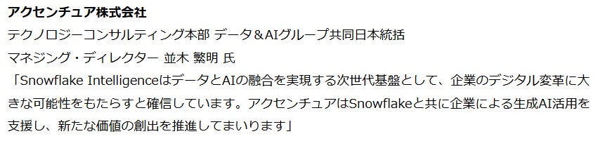 Snowflakeは今後も、企業のAIエージェント導入を支援し、データとAIを活用した競争力強化を促進するパートナーエコシステムとの連携も一層強化してまいります。以下に、Snowflake Intelligenceに関するローンチパートナーからのコメントをご紹介します。