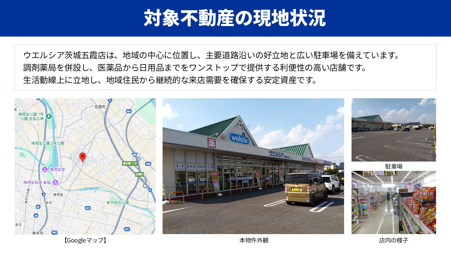 茨城県猿島郡五霞町に位置する、調剤薬局を併設したロードサイド型ドラッグストア「ウエルシア茨城五霞店」を対象としたプロジェクトです。