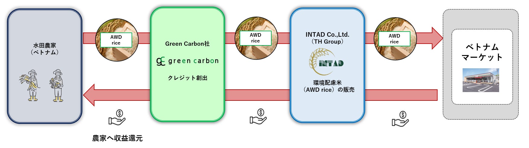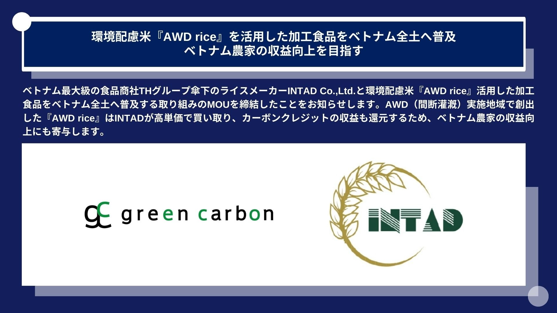 Green Carbon株式会社(代表取締役:大北潤、以下Green Carbon(読み:グリーンカーボン)はこの度、 ベトナム最大級の食品商社THグループ傘下のINTAD Co.,Ltd.(代表:Nguyen Bui Cong、以下INTAD)と環境配慮米『AWD rice』を活用した加工食品をベトナム全土へ普及する取り組みのMOUを締結したことをお知らせします。*¹AWD(間断灌漑)実施地域で創出した『AWD rice』はINTADが高単価で買い取り、カーボンクレジットの収益も還元するため、ベトナム農家の収益向上にも寄与します。